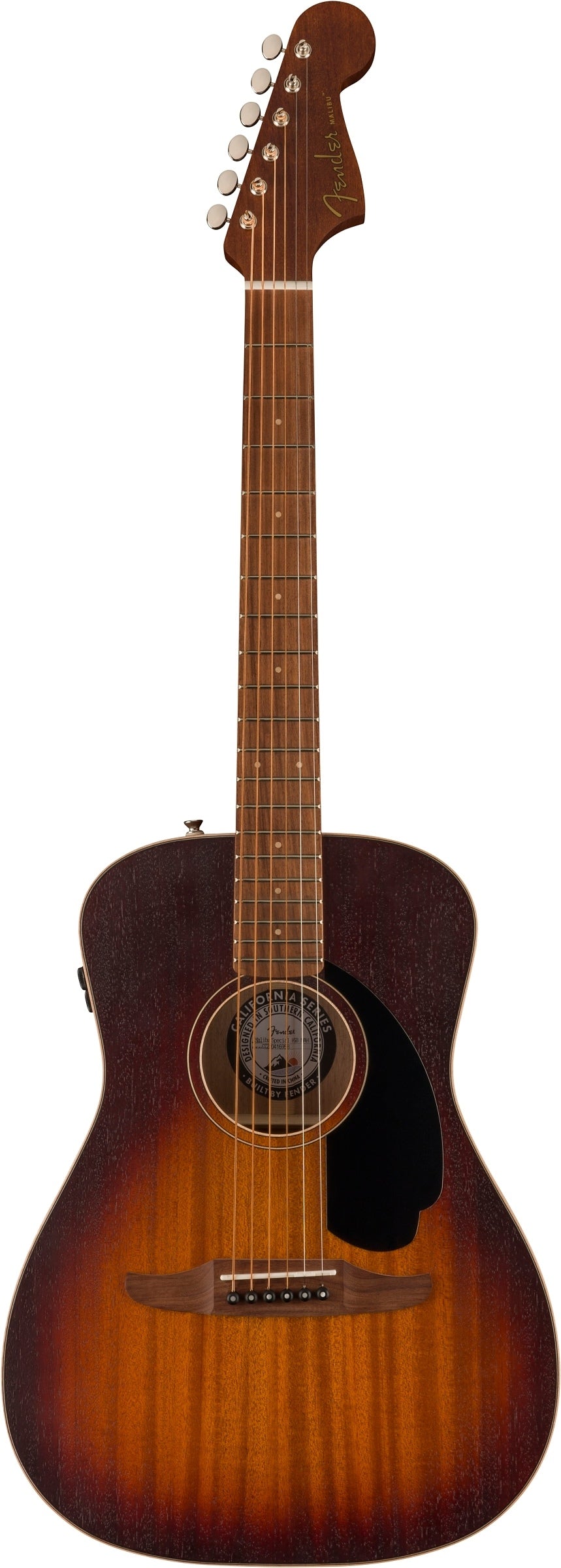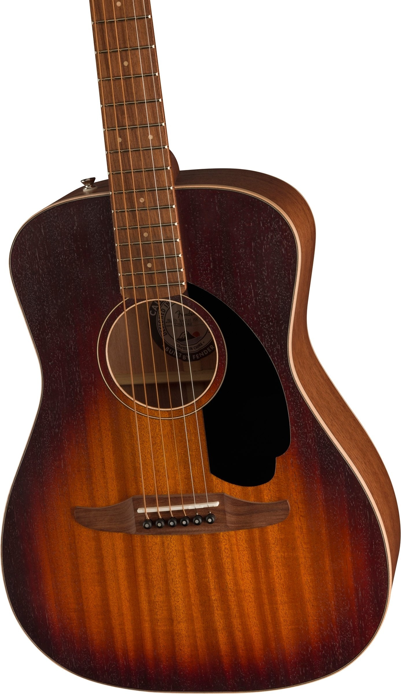 Crafted with an X-braced solid okoume top and solid okoume back and sides, the compact parlor-sized body of the Malibu Special produces a voice that's impressively articulate, punchy, and delicate, while offering superior comfort for hours of creativity. The neck is designed with an easy-to-play slim "C"-shaped profile, a short 24" scale length, and a tilt-back 6-in-line headstock for a distinctive look born from Fender's electric guitar DNA. Other notable details include vintage-style tuning machines for smooth, accurate tuning, a maple rosette and body binding for an upscale look, and a bone nut and saddle for rich harmonic character. Designed for the performer, the Fishman® Flex Body preamp system blends an undersaddle piezo and internal body transducer to allow faithful and reliable reproduction of the guitar's natural sound when plugged into an amplifier, PA system or recording device.
