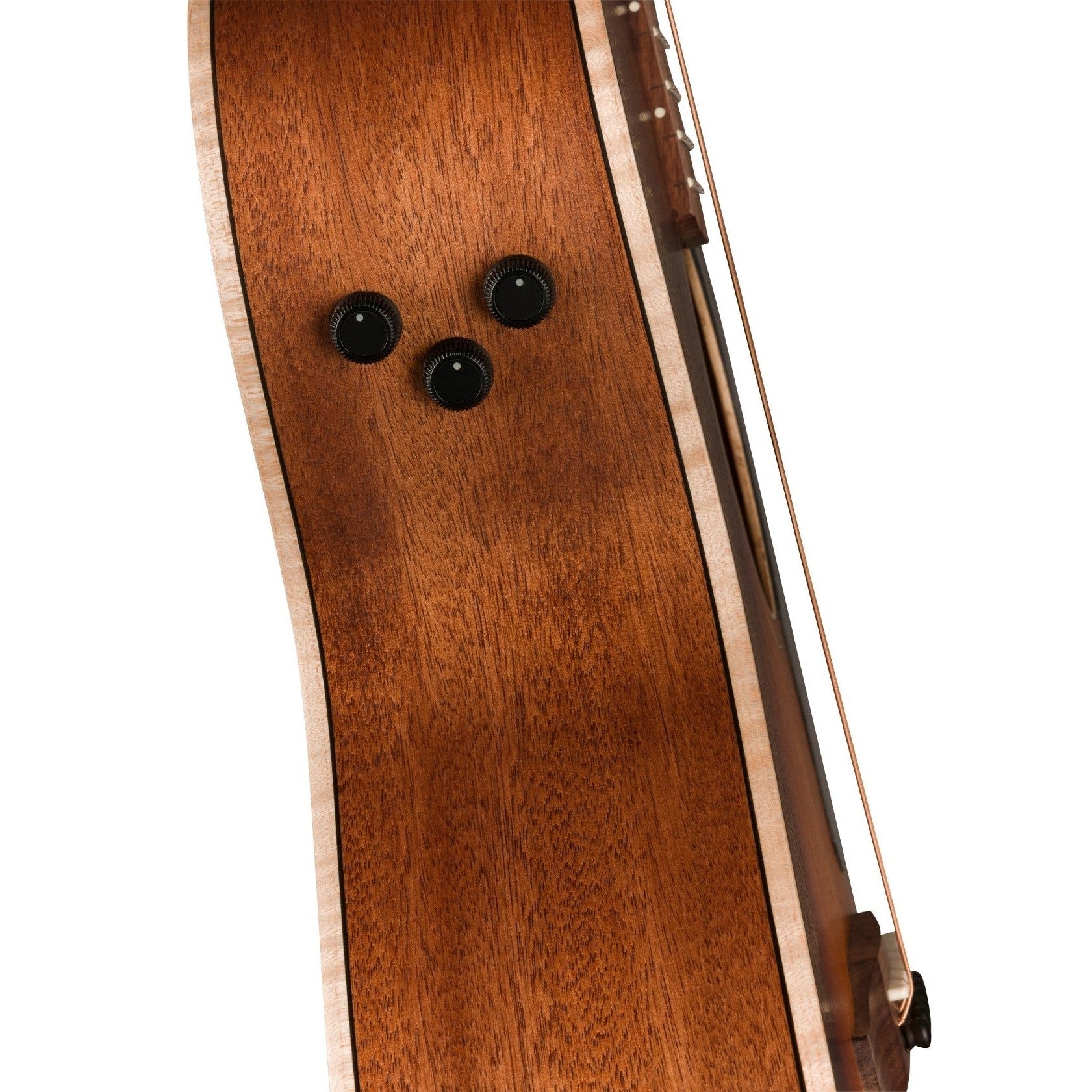 Crafted with an X-braced solid okoume top and solid okoume back and sides, the approachable mid-size auditorium body of the Newporter Special produces a balanced voice that's impressively resonant, articulate and powerful, while offering superior comfort for hours of creativity. The nato neck is designed with an easy-to-play slim "C"-shaped profile, a 25.5" scale length, and a tilt-back 6-in-line headstock for a distinctive look born from Fender's electric guitar DNA. Other notable details include vintage-style tuning machines for smooth, accurate tuning, a maple rosette and body binding for an upscale look, and a bone nut and saddle for rich harmonic character. Designed for the performer, the Fishman® Flex Body preamp system blends an undersaddle piezo and internal body transducer to allow faithful and reliable reproduction of the guitar's natural sound when plugged into an amplifier, PA system or recording device.