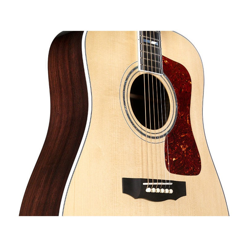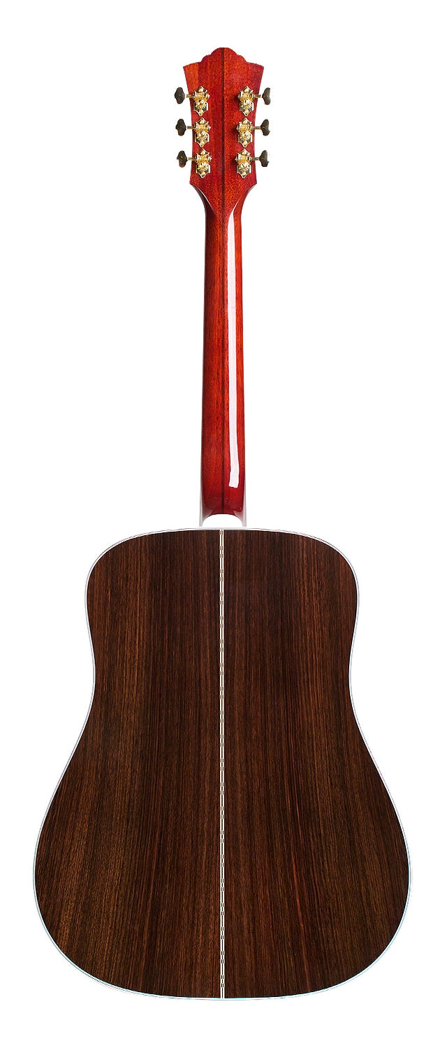 First introduced in 1968 as a special-order top-of-the-line model, the D-55 was so well-received that Guild added it into the regular production line by 1974. Famously played by Tommy Smothers on the Smothers Brothers Show in the late 1960s, the D-55 grew in both popularity and longevity over the decades. The most anticipated return of a Guild acoustic to date, the 2017 Guild D-55 is back and better than ever. The D-55 remains true to all the premium appointments of its 1968 predecessor, including a AAA Sitka spruce top, solid Indian Rosewood back and sides, ebony fingerboard and bridge, and nitrocellulose finish. Internal refinements include scalloped Adirondack bracing as well as an improved dovetail neck-joint, hand-fit to make this generation of D-55 the lightest, loudest, and best-sounding yet. The D-55 showcases Guild’s most recognizable headstock which is fully bound and features the Guild “Peak and Shield” inlay combination over a figured ebony overlay. The matching ebony fingerboard is also fully bound and inlayed with Guild’s iconic abalone / pearl “V-Blocks” and multi-line “railroad track” purfling on the bass and treble sides. The D-55’s fingerboard is set on an all-mahogany neck with beautiful walnut center seam running the length of the heel to headstock. The D-55’s nitro finish is hand-sprayed for minimum thickness and maximum resonance that will only get better with age. An LR Baggs pickup system is available as an option, and each guitar includes a hand-signed certificate of authenticity and ships with Guild’s Premium humidified hardshell case.