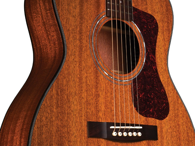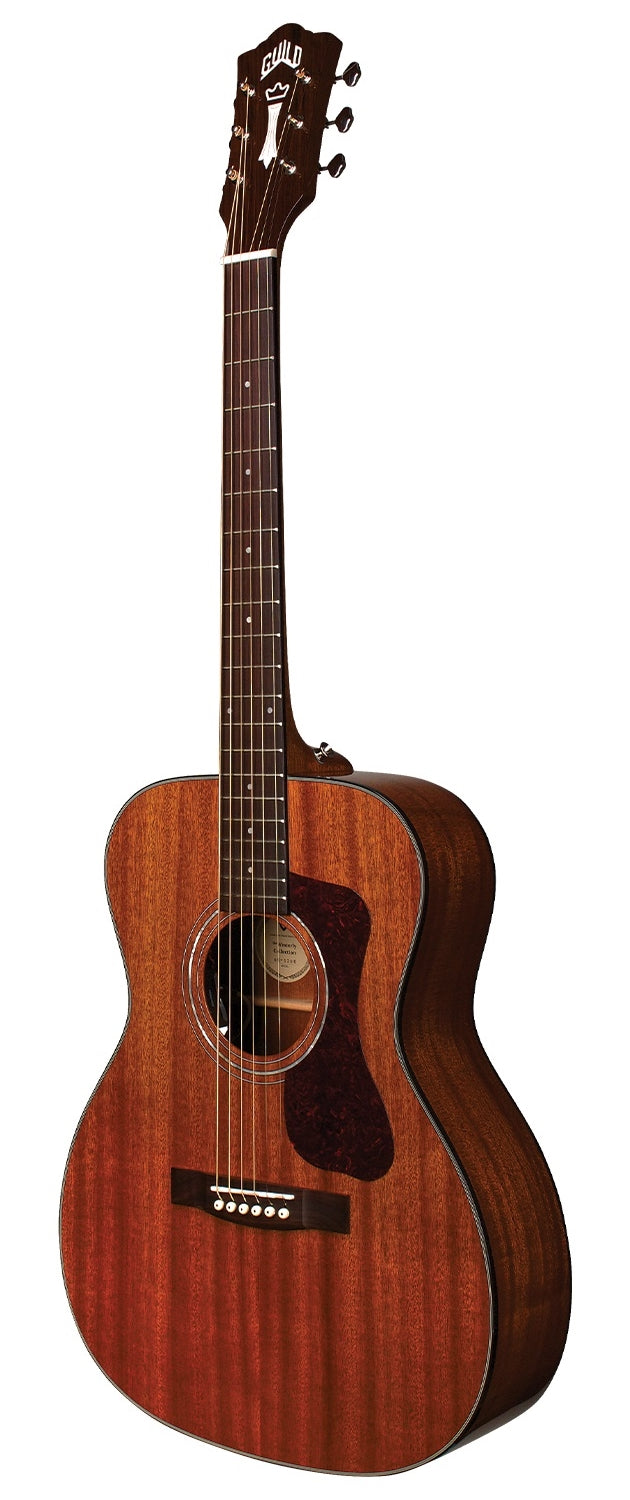 This mid-sized orchestra shaped acoustic is equally suited for strumming and fingerpicking, and produces a sweet, balanced tone. The perfect choice for the versatile musician, the OM-120 features a solid African mahogany top and solid African mahogany back and sides. Other premium features include a bone nut and saddle and mother-of-pearl rosette. This model also has a 1¾” nut width on a vintage shaped Guild neck, iconic Chesterfield headstock emblem reminiscent of 1960s Guilds, period-correct tortoiseshell pickguard, and Guild’s new premium acoustic gig bag.
