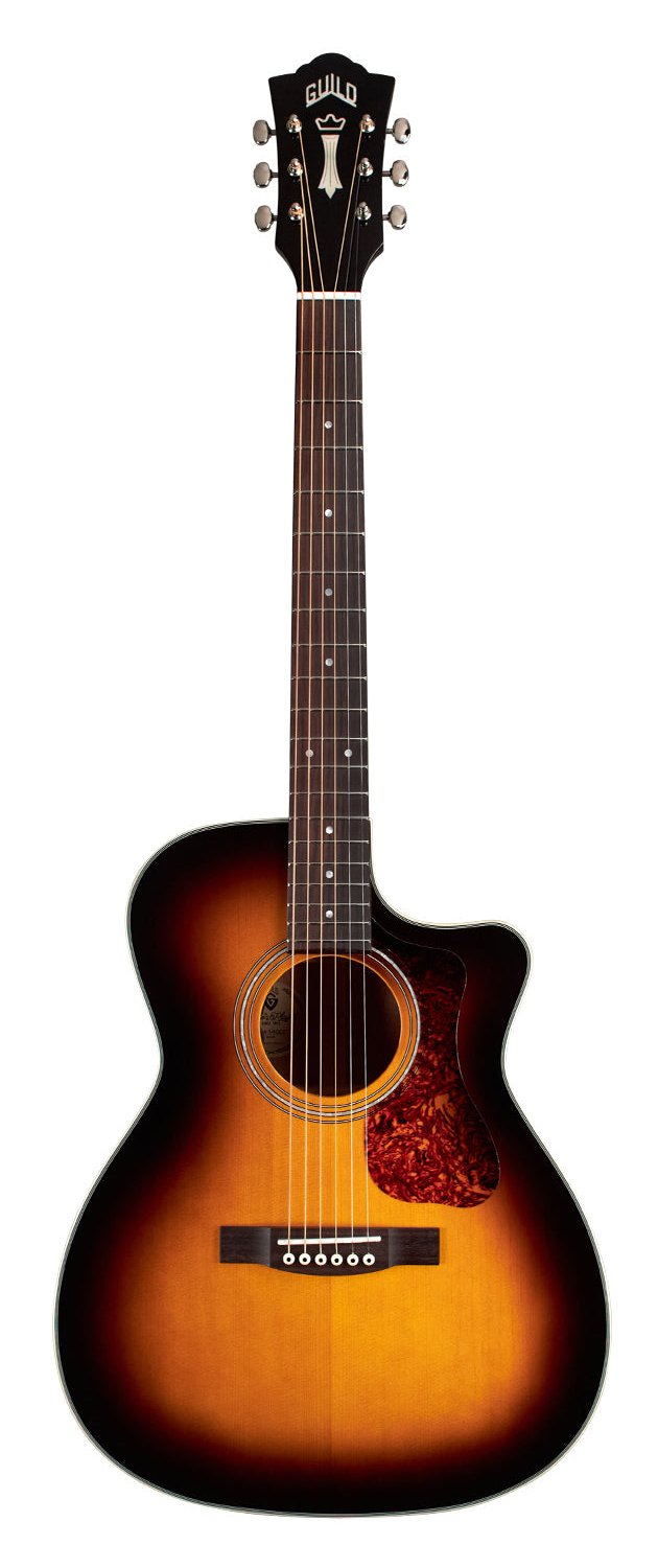 This mid-sized orchestra-shaped acoustic is equally suited for strumming and fingerpicking, and produces a sweet, balanced tone. The perfect choice for the versatile musician, the OM-140CE features a solid Sitka spruce top, solid African mahogany back and sides, and an elegant cutaway for access to higher frets. The hidden Guild/Fishman GT-1 Pickup System gives this guitar a perfectly amplified boost for gigs and live performances. Other premium features include a bone nut and saddle and mother-of-pearl rosette. This model also has a 1 3/4" nut width on a vintage-shaped Guild neck, iconic Chesterfield headstock emblem reminiscent of 1960s Guilds, period-correct tortoiseshell pickguard, and Guild's new premium acoustic gig bag.