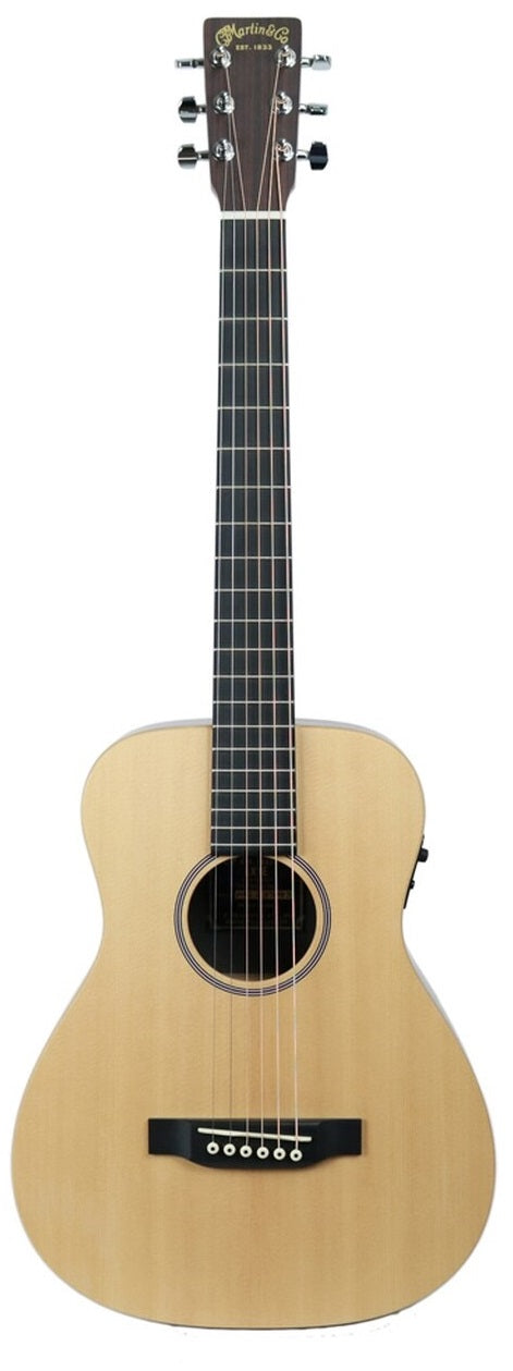 LX1E Little Martin Guitar While the Little Martin is our smallest guitar, it is very big on tone, quality and versatility. The LX1E acoustic electric model features a solid Sitka spruce top, mahogany high-pressure laminate (HPL) back and sides, and a warm satin finish. It’s ideal for travel, student practice or for just playing around the house or campfire. This model includes SUSTAINABLE WOOD CERTIFIED parts. See specifications for details. SPECIFICATIONS OVERVIEW BODY SIZE:Modified 0-14 Fret FINISH TOP:Hand-Rubbed CONSTRUCTION:Mortise & Tenon Neck Joint BACK & SIDE FINISH:N/A BRACING PATTERN:X-Brace SCALE LENGTH:23'' BRACE SHAPE:Non-Scalloped FINGERBOARD WIDTH AT NUT:1 11/16'' TOP MATERIAL:Sitka Spruce NECK SHAPE:Modified Low Oval BACK MATERIAL:HPL NECK TAPER:Standard Taper SIDE MATERIAL:HPL ELECTRONICS:Fishman® Sonitone RECOMMENDED STRINGS:Authentic Acoustic Lifespan® 2.0 Medium - 92/8 Phosphor Bronze MA550T TOP TOP COLOR:Clear BRIDGE STYLE:Junior Style Belly BINDING:N/A BRIDGE STRING SPACING:2 1/8'' TOP INLAY MATERIAL:N/A BRIDGE MATERIAL:FSC® Certified Richlite® TOP DETAIL:N/A BRIDGE PIN MATERIAL:White Plastic PICKGUARD:N/A BRIDGE PIN DOTS:Black Plastic PICKGUARD INLAY:N/A SADDLE:Compensated White Tusq ROSETTE:Multi-Stripe SADDLE RADIUS:16" BODY BRACE MATERIAL:Sitka Spruce BACK & SIDES COLOR:N/A BRACE SIZE:5/16" BACK DETAIL:Mahogany Pattern BACK PURFLING/STRIP:N/A BACK INLAY MATERIAL:N/A HEELCAP:N/A SIDE DETAIL:Mahogany Pattern ENDPIECE:N/A SIDE INLAY MATERIAL:N/A ENDPIECE INLAY:N/A NECK NECK MATERIAL:Rust Birch Laminate FINGERBOARD MATERIAL: FSC® Certified Richlite® FINISH NECK:Hand-Rubbed FINGERBOARD WIDTH AT 12TH FRET:2 1/16'' NECK COLOR:N/A FINGERBOARD INLAY STYLE:N/A NUMBER OF FRETS TOTAL:20 FINGERBOARD INLAY MATERIAL:None NECK JOINS BODY AT:14th Fret FINGERBOARD BINDING MATERIAL:None SIDE DOTS:White HEADSTOCK HEADSTOCK SHAPE:Solid with LX Taper TUNING MACHINES:Chrome Enclosed Gear HEADPLATE MATERIAL:HPL KNOB:Small HEADPLATE LOGO STYLE:Script Ink NUT MATERIAL:White Corian HEADPLATE BINDING MATERIAL:N/A MISC CASE:Soft Gig Bag LEFT HANDED AVAILABILITY:Yes LABEL:Foil Label PLEKED:No