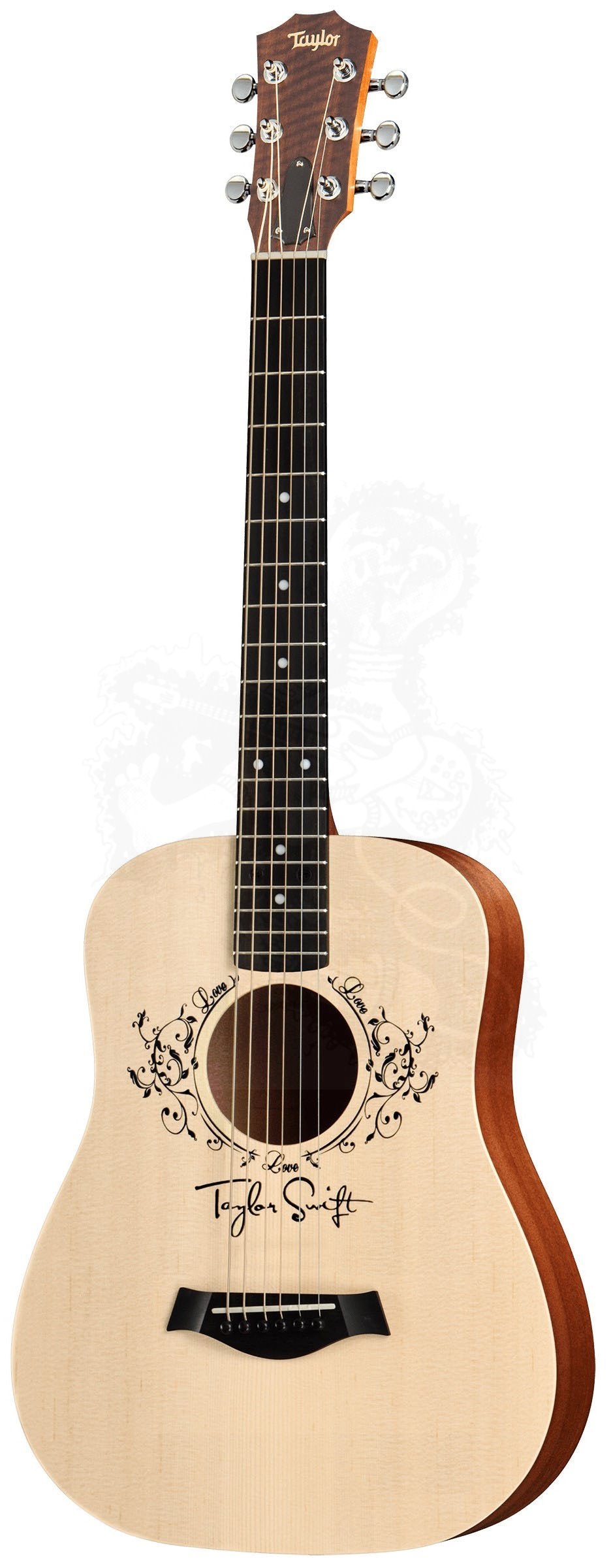 Inspired by memories of writing songs on her own Baby Taylor, Taylor Swift collaborated with Taylor Guitars to design the Taylor Swift Baby Taylor (TSBT). Based on our compact ¾-scale Dreadnought, the TSBT is crafted from a resilient layered sapele body with a solid Sitka spruce top. Swift’s custom, screen-printed rosette design features the word “Love” three times among a delicate vine motif. The personalized design also features her signature above the bridge. With a slim 1 11/16-inch neck and a compact shape, the guitar is perfect for a young, aspiring tunesmith.