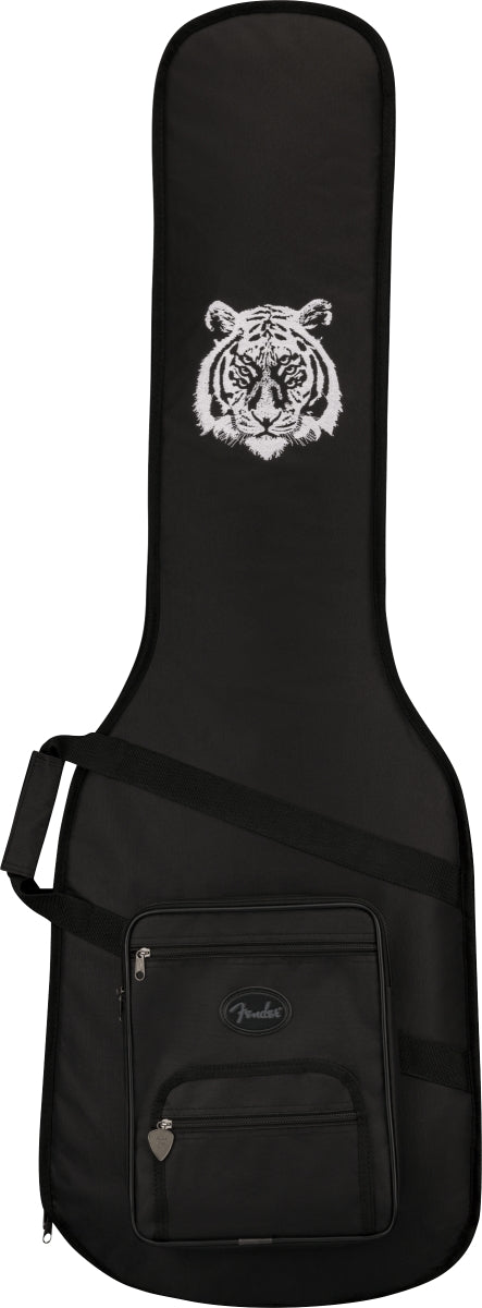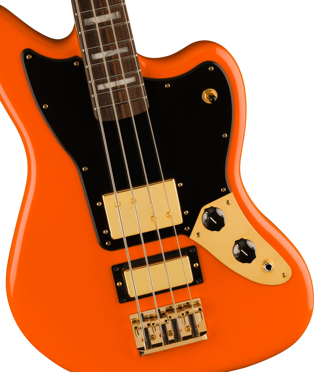 The Mike Kerr Jaguar® Bass delivers the ferocious tones that ignite the iconic riffs of chart-topping British rock duo Royal Blood. Featuring an alder body and a maple neck with slab rosewood fingerboard, this classic Fender tonewood formula delivers well-defined punch, massive resonance and ample warmth. Effortlessly playable, the compact 30" scale length Modern "C"-shaped neck sports a slim profile and medium jumbo frets on a 9.5" radius fingerboard for a modern playing feel. Outfitted with a versatile set of high-output humbuckers, the Mike Kerr Jaguar® Bass is uniquely suited to replicate Mike's aggressive, anthemic riffs and searing lead lines. Gleaming gold hardware and elegant block inlays complement the vibrant Tiger's Blood Orange finish to create a truly striking aesthetic.