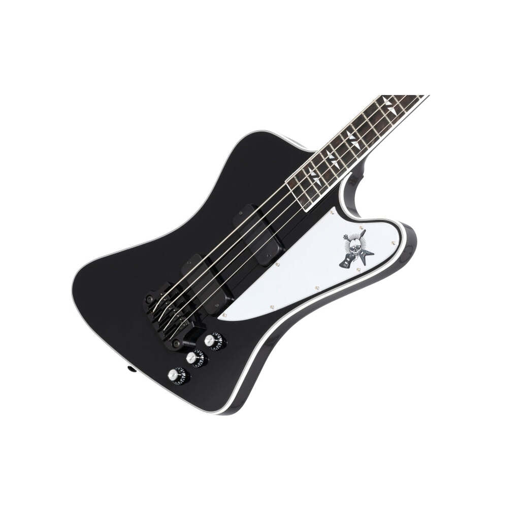 Gene Simmons is a legendary rock icon and the bassist from KISS, and his new Gibson Gene Simmons G2 Thunderbird Bass reflects his tastes. Designed to meet the musical needs of modern bassists, it features the classic Reverse Thunderbird body and headstock shape. The G2 Thunderbird Bass is voiced with a pair of powerful T-Bird pickups, each with individual Volume controls and paired with a master Tone control. The bound ebony fretboard features pearloid reverse split diamond inlays. A Graph Tech nut and Hipshot Mini-Clover tuners keep the tuning rock-solid, while the other end of the strings anchor to a Hipshot Bass Bridge. The back of the headstock features a G2 logo. The Ebony nitrocellulose lacquer finish is paired with Black Chrome hardware and a Mirror Plex truss rod cover and Mirror Plex pickguard with a laser engraved custom Gene Simmons logo. A modern hardshell case is included.