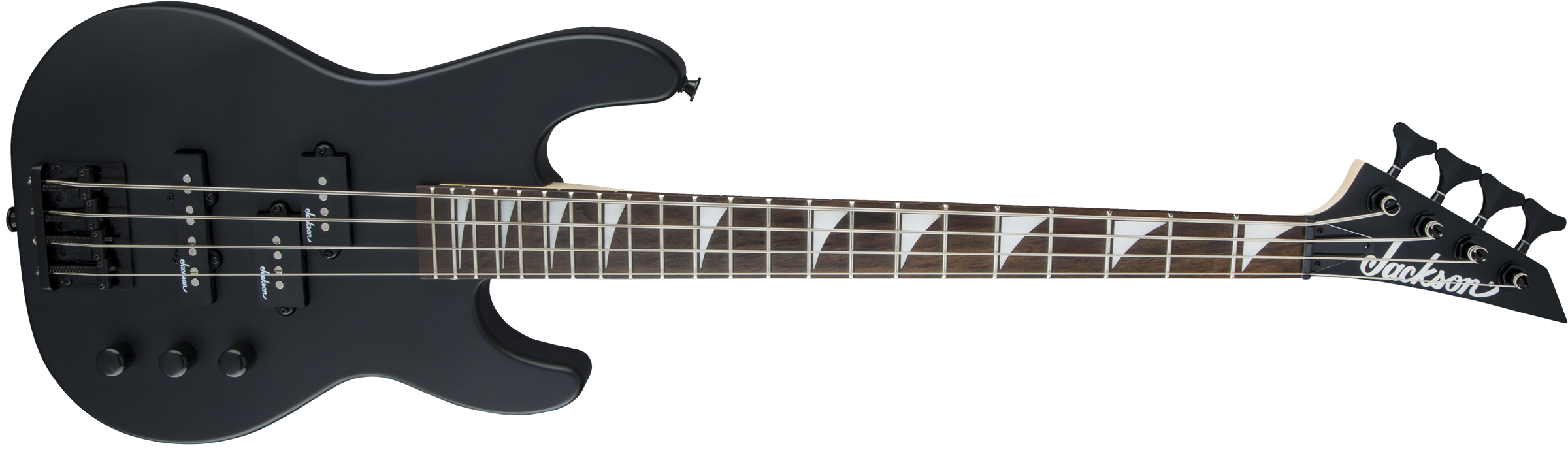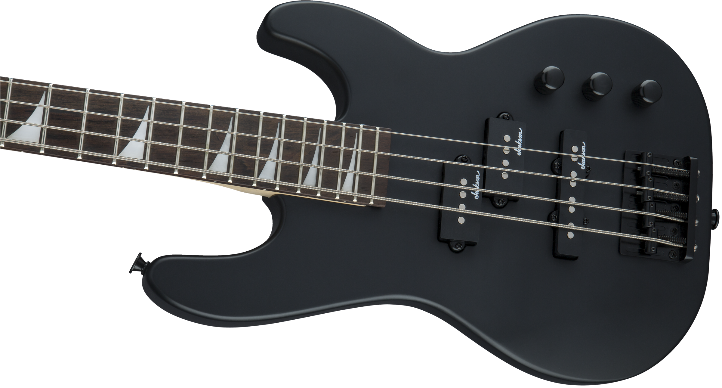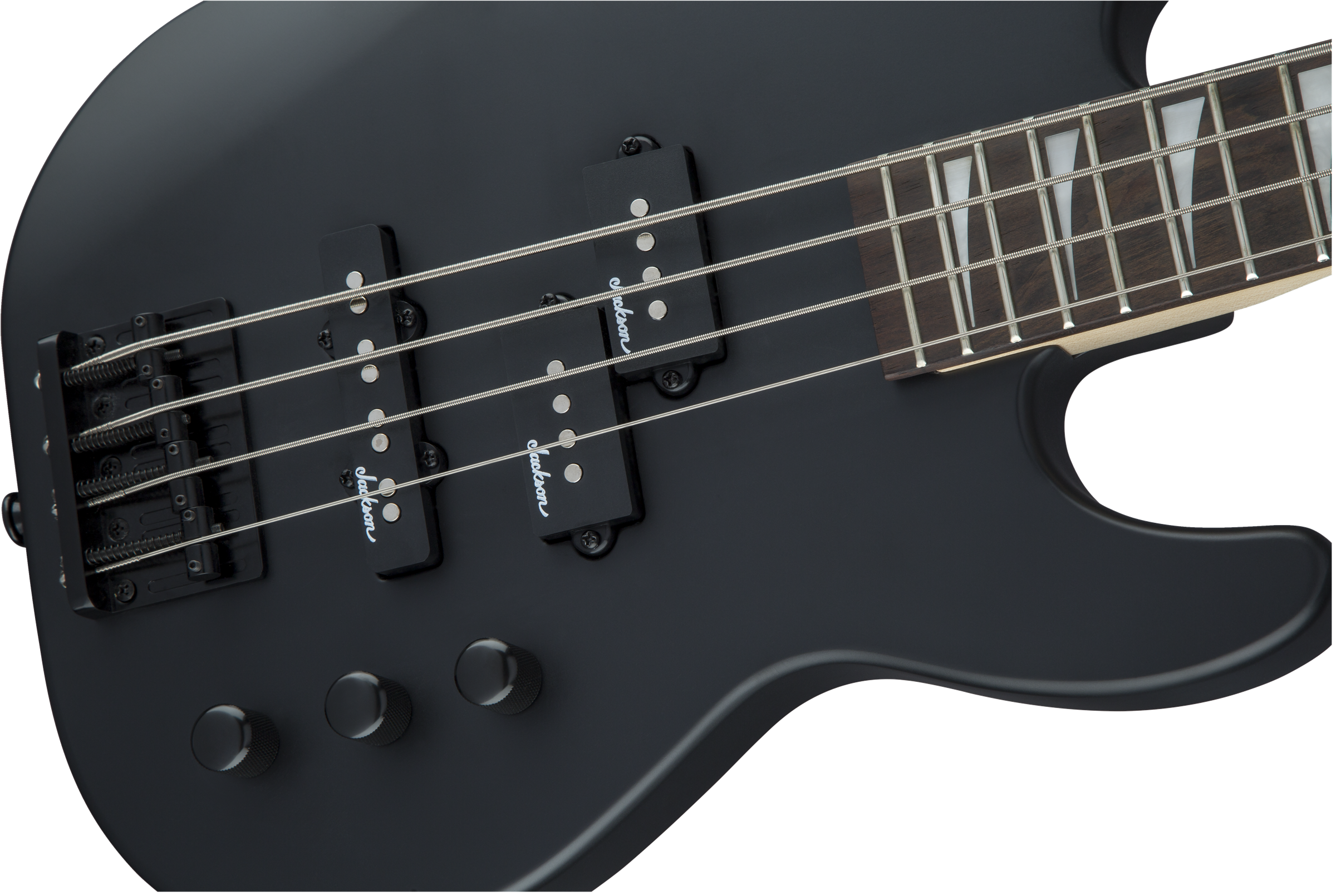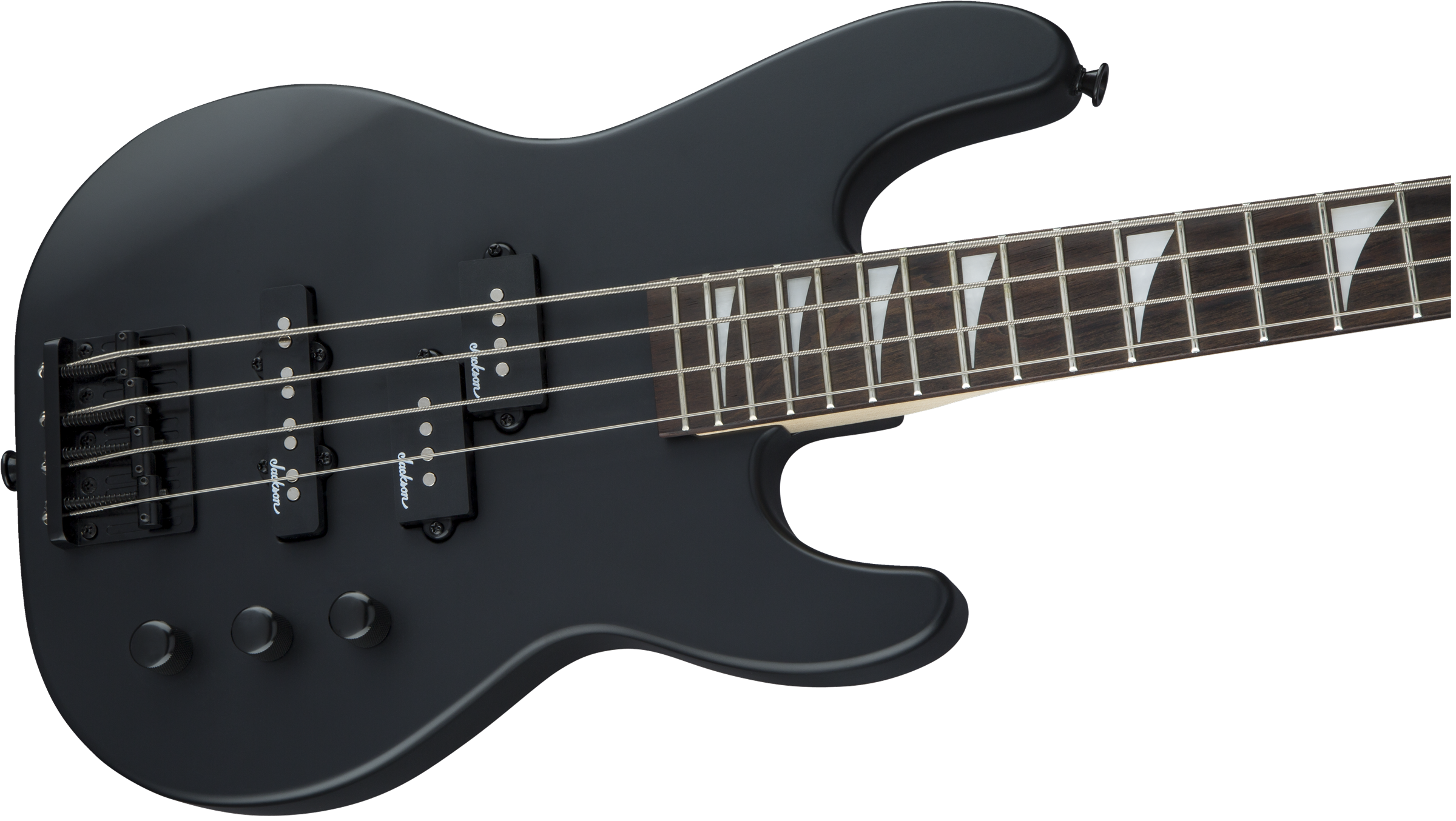A Jackson P style neck pickup and Jackson J style bridge pickup power this 4-string bass, which also features a pair of volume knobs, single tone knob, hardtail bridge with black base plate and Jackson-branded tuners.