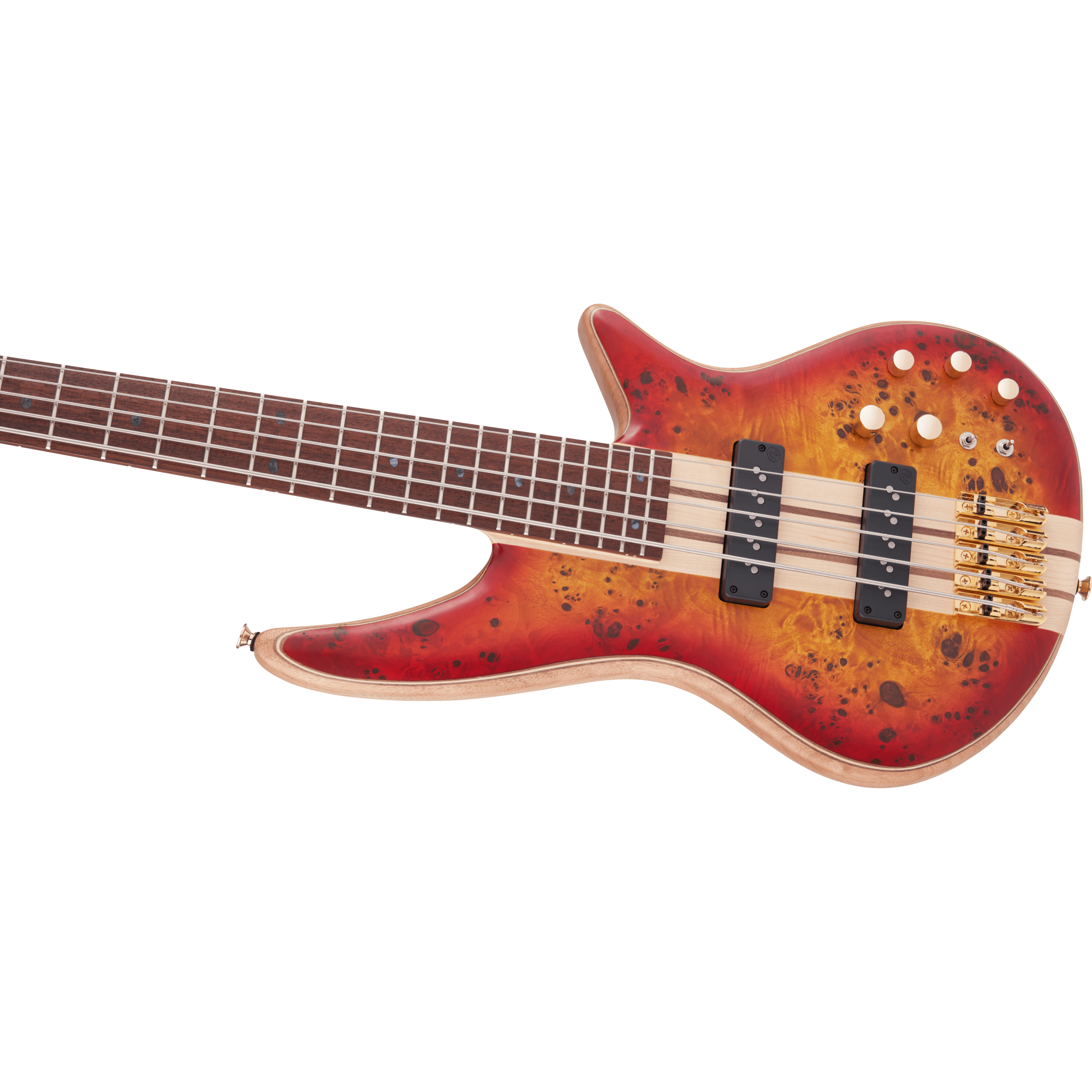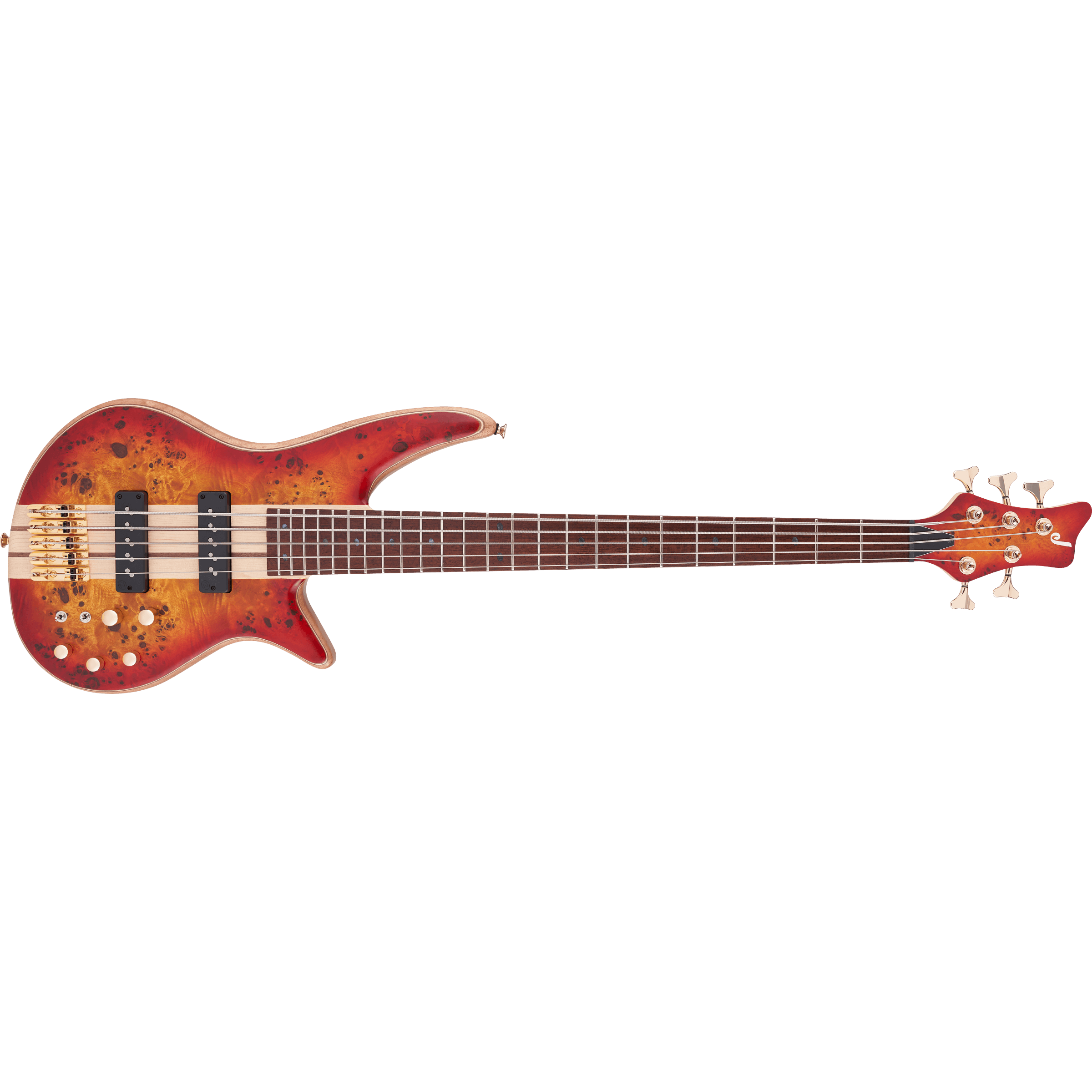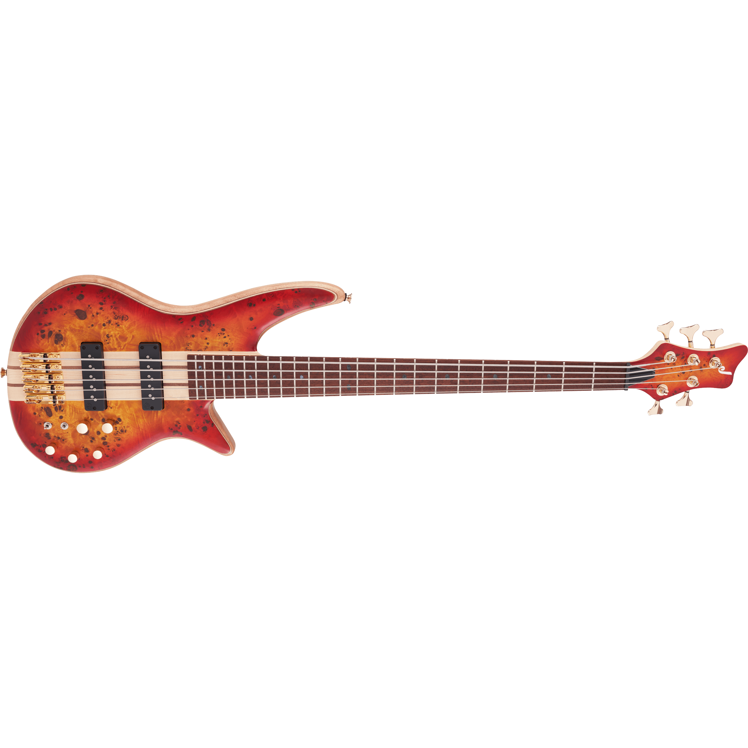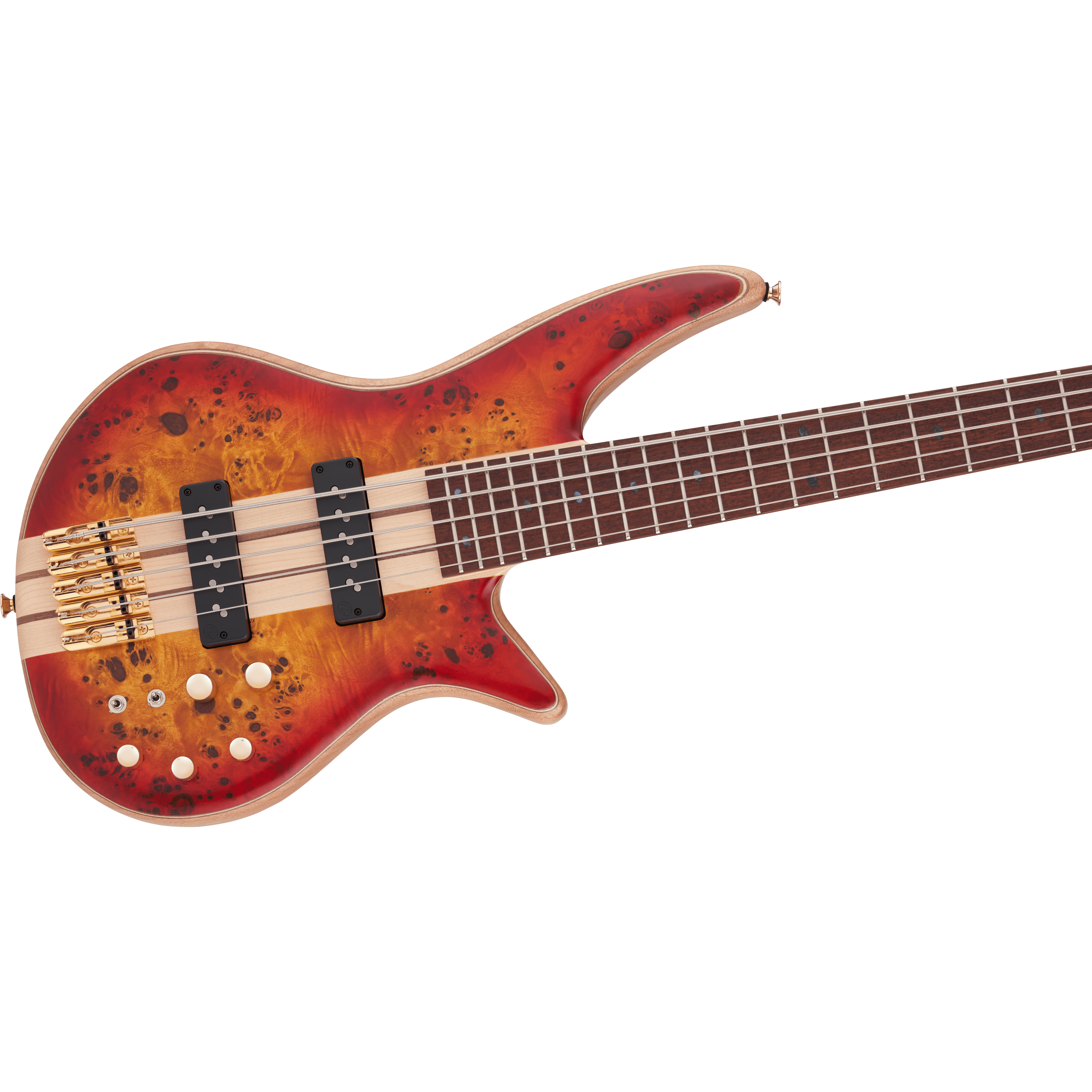 Starting with style, the all-new Pro Series Spectra Bass SBP V features a unique multi-laminate poplar burl/walnut/maple/walnut/mahogany body wrapped in an elegant Transparent Cherry Burst finish, complete with a unique 3x2 color matched headstock with an understated "J" logo and gold hardware.
