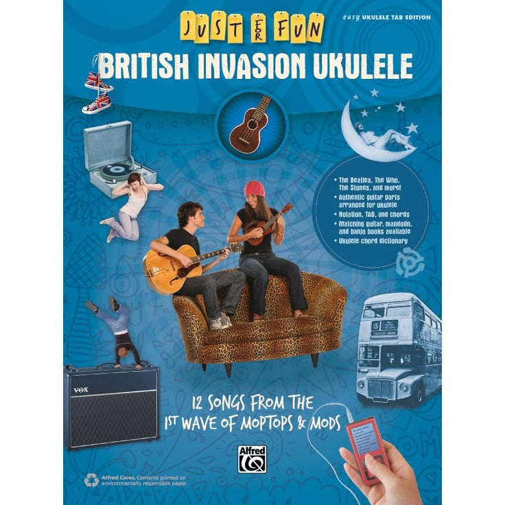 Just for Fun: British Invasion Ukulele is designed for your total enjoyment. Each featured song is arranged for ukulele based on the original guitar parts, simplified just enough to keep it fun and easy, yet musically very satisfying. Standard notation, TAB, chords, lyrics, and a chord dictionary are included. Plus, guitar, mandolin, and banjo books with matching arrangements are available---just for fun! Titles: 19th Nervous Breakdown (The Rolling Stones) * As Tears Go By (Marianne Faithfull) * Dedicated Follower of Fashion (The Kinks) * I Saw Her Standing There (The Beatles) * The Kids Are Alright (The Who) * Please Please Me (The Beatles) * (I Can't Get No) Satisfaction (The Rolling Stones) * Shapes of Things (The Yardbirds) * She's Not There (The Zombies) * Tell Her No (The Zombies) * When You Walk in the Room (The Searchers) * You've Got Your Troubles (The Fortunes).