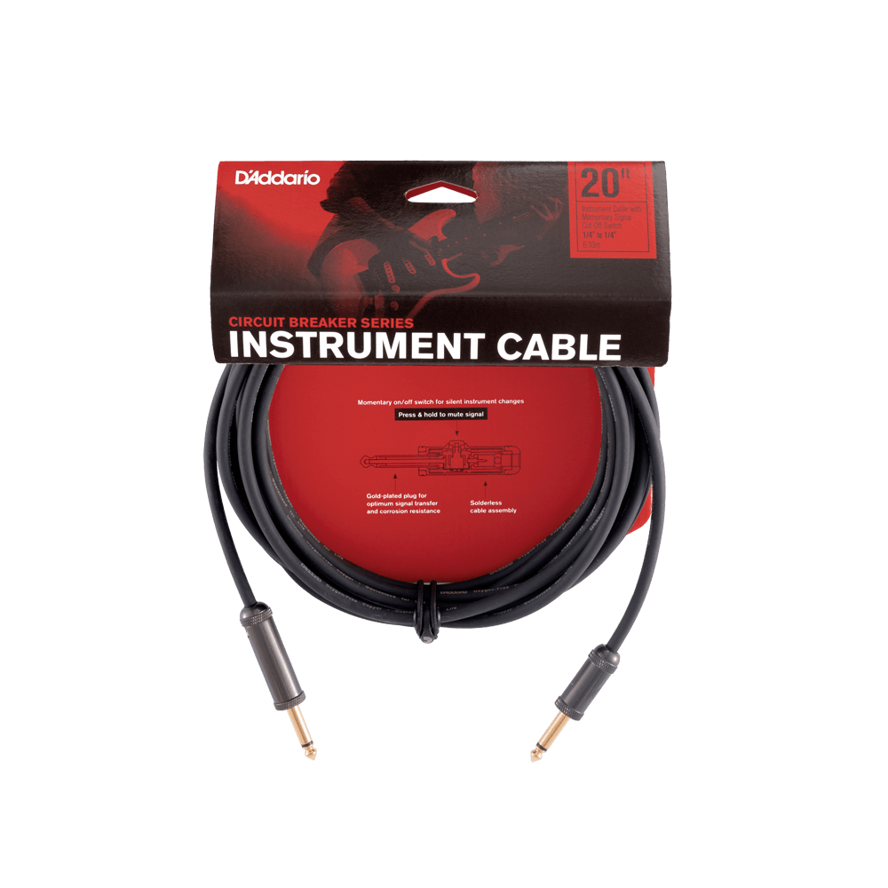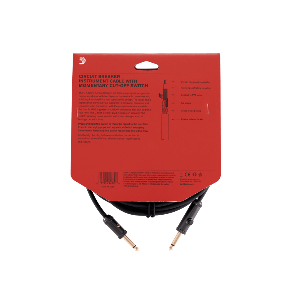 The D'Addario Circuit Breaker instrument cable features an actuated “kill switch” that allows for noise-free instrument changes. Press the switch once to mute the signal to the amplifier completely. Press again to reactivate the signal flow. Available in latching or momentary switches in straight or right-angle plugs in a variety of lengths. Circuit Breaker cables utilize ultra-pure, oxygen-free copper conductors for low capacitance and pure tone. Solderless plugs ensure a solid connection and are easy to fix on the gig with a simple cutter and screwdriver. Two layers of shielding provide 100% coverage for superior insulation and noise rejection, making this the ultimate, high-performance cable.