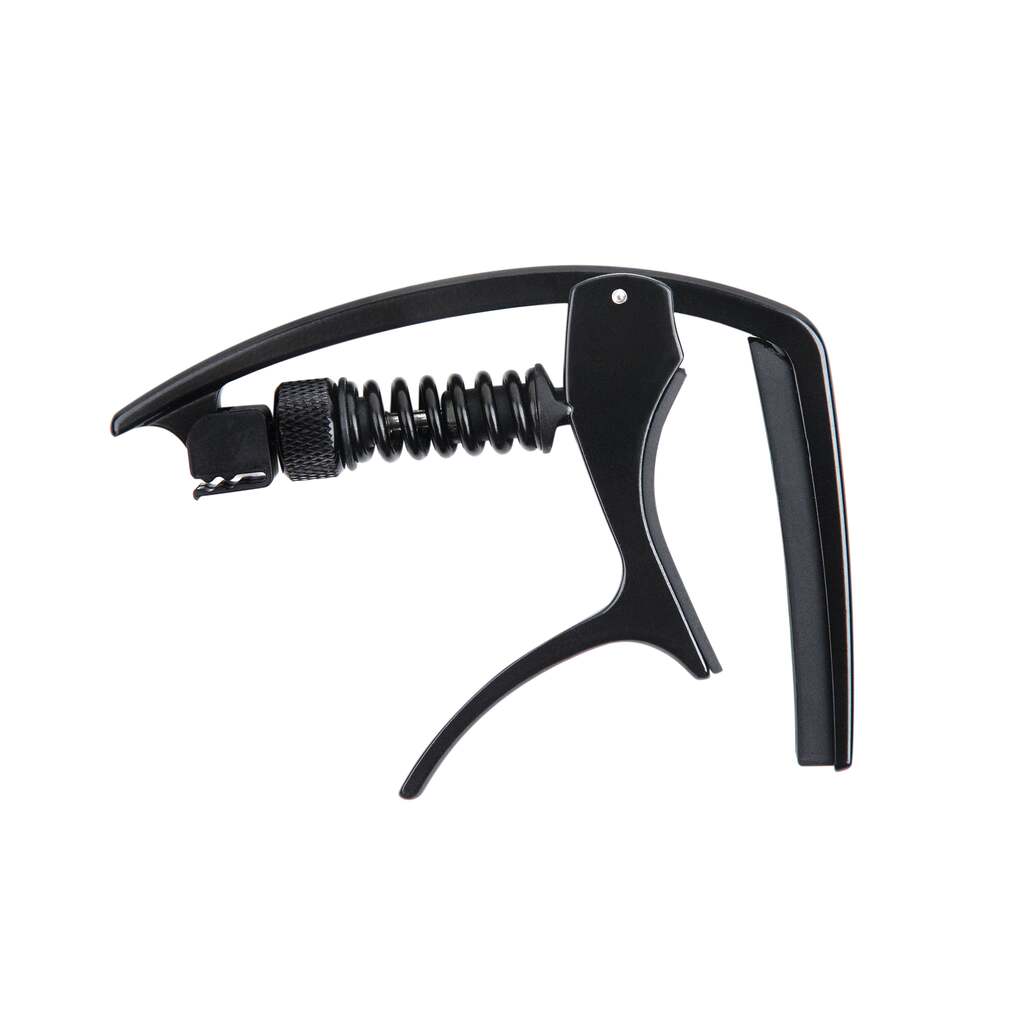 The NS Tri-Action capo in black assures buzz-free, in-tune performance at any fret. The patent-pending Tri-Action geometry reduces the force required to open and close the capo and applies even tension regardless of neck profile. Combined with the micrometer tension adjustment and direct horizontal pressure, the Tri-Action Capo virtually eliminates pulling the strings side to side and the need to retune during use. Additionally, the lightweight aluminum construction adds negligible weight to the neck of the instrument. The capo features an integrated pick holder and is a Ned Steinberger design.