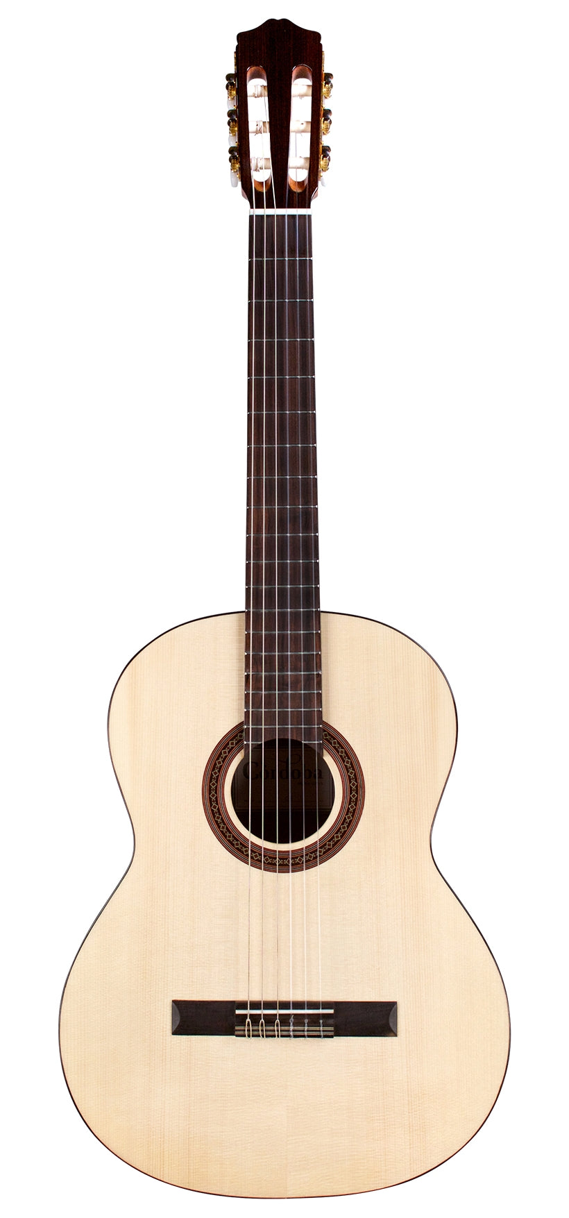 Based on Córdoba's flagship C5, the C5 Spruce adds a new option to a fan favorite. Perfect as a first nylon-string guitar, this lightweight model is built with a solid Engelmann spruce top and mahogany back and sides to produce a clear, powerful tone with beautiful sustain. Handmade in the traditional Spanish style, the C5's carved headstock, hand-inlaid wood rosette, Pau Ferro binding, Savarez strings, and glossy PU finish result in a guitar that truly stands out from all other entry-level options. A lightweight adjustable truss rod is built into the neck for stability. Available in Natural finish with solid Engelmann Spruce top.