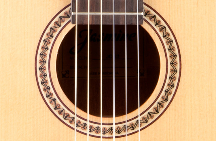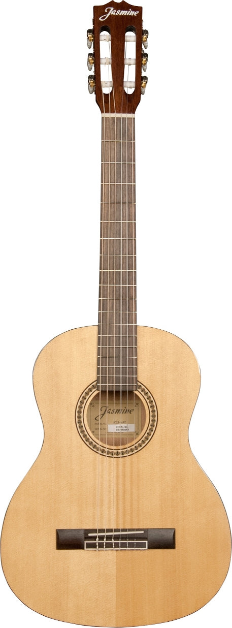 The Jasmine JC-23 is a 3/4 size classical guitar that offers great nylon string sound in a package that’s just the right size. Great for developing players or anyone looking for a great sounding, easy playing guitar, the JC-23 features a select spruce top with Jasmine’s Advanced Classical Bracing, and sapele back and sides for superior tone. The slim satin finished neck and short 23 3/8″ scale length provide smooth, comfortable feel and excellent playability that will have you playing for hours. Other great features include a rosewood fingerboard and bridge, a beautiful mosaic rosette and a gloss finished top.