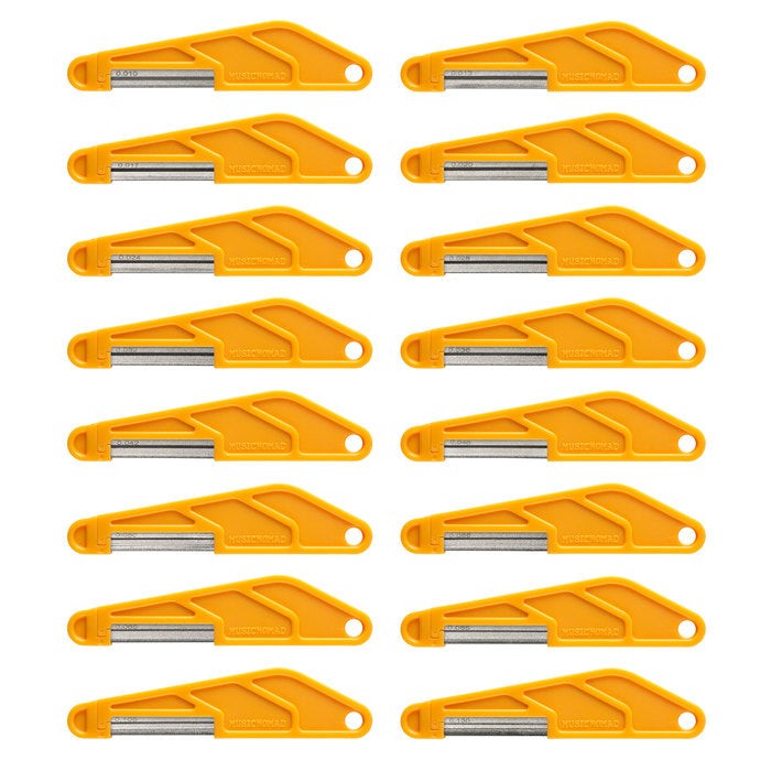 MusicNomad’s patent-pending Nut Files feature a revolutionary diamond coating & round “string-shape” blade design resulting in smooth, precision cuts. They cut & polish slots at the same time & do not drift like common toothed files. The industrial, even diamond coating cuts & polishes all the most common nut materials such as nylon, bone, graphite & tusq. They even work amazing on saddles. We added an ergonomic handle for total comfort & control of your cut, or you can remove the blade from the handle as an alternative cutting option. This custom set includes all 16 sizes starting with 0.010” up to 0.130”; they work great for electric, acoustic & classical guitars & even 5-string basses. We even include an organizational storage case to hold all 16 files and a convenient cleaning brush. That’s MusicNomad quality – raising the bar in equipment care.