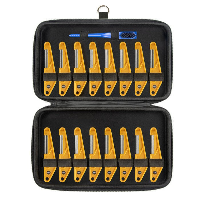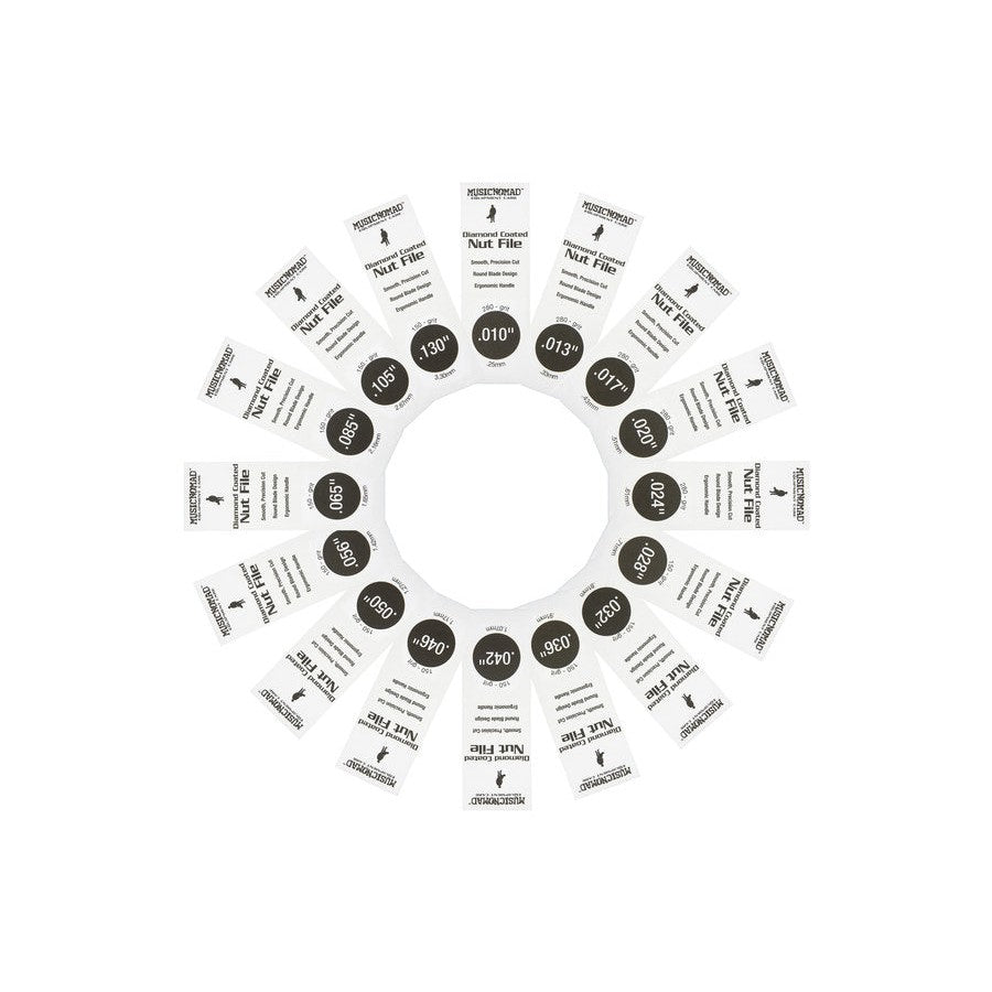 - The Entire 16-Piece Nut File Set Perfect for Any Job, Any Instrument. Includes: 0.010", 0.013", 0.017", 0.020", 0.024", 0.028", 0.032", 0.036", 0.042", 0.046", 0.050", 0.056", 0.065", 0.085", 0.105", 0.130". Comes with an Organizational Storage Case (12" x 7" x 2") and a Handy Cleaning Brush.