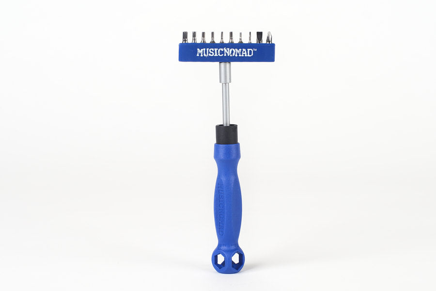 Forget lugging around screwdrivers, nut drivers, wrenches and Allen Keys or multiple bit sets in bulky cases, The Octopus 17 ‘n 1 Tech Tool can handle every job! MusicNomad’s patent-pending, innovative design is the perfect tool for tightening or loosening screws and hex nuts on vital gear components like bridges, saddles, locking nuts, output jacks, control pots, tuning machine bushings and more. Just say no to metal.... tools that is! Our ergonomic handle is made from strong ballistic nylon material that won’t scratch or ding your hardware and is engineered for the most popular hex wrench sizes: 10 mm, 12 mm, 14 mm, 1/2” (2) & 7/16”. Our unique handle also holds the universal adapter giving you even more versatility. The metal universal adapter features a 7th 1/4” hex wrench for tightening or loosening hex nuts, in addition it securely holds our 10-pc screwdriver bit set. Our screwdriver bit set features Phillips & flat head bits along with 8 Allen key bits (0.050", 1/16", 3/32", 1.5 mm, 2.0 mm, 2.5 mm, 3.0 mm, 4.0 mm) for nearly any kind of screw you may find on your gear. It tackles every job including precision adjustments to pieces like tremolo systems. Take out the universal adapter to utilize our 1/2” narrow-profile hex wrench for tightening tough-to-reach sunken pots & Tele cups. This little tool delivers big results and is a must-have for every instrument case.