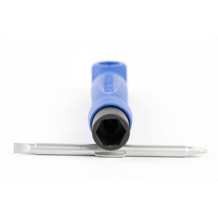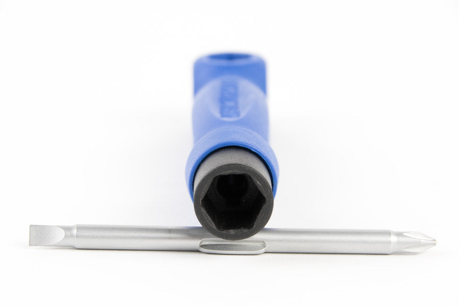 Forget lugging around a bunch of screwdrivers, nut drivers & wrenches when The Octopus 8 'n 1 Tech Tool can handle the job! MusicNomad's patent-pending, innovative design is perfect for tightening or loosening output jacks, strap locks, control pots, tuning machine bushings & screws. It features both a Phillips & flat-blade screwdriver with our reversible shaft design and is engineered for the most popular hex wrench sizes: 10 mm, 12 mm, 14 mm, 1/2" & 7/16". Remove the screwdriver and use the 1/2" narrow-profile hex wrench for tightening sunken pots and Tele cups. Just say no to metal. Our hex wrenches are made with strong ballistic nylon material that can handle any job without the worry of scratching your hardware or finish. Small in size but big in results, our 6" / 15-cm overall length is a must-have for every guitar case.