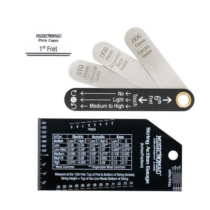 Get our two most popular precision gauges in this combo pack. Measuring your neck relief and string action height are the two most common tasks performed to improve your guitar or bass playability and sound. First step is to use MusicNomad's Precision Truss Rod Gauge that comes equipped with the 3 most common relief measurements (0.006”, 0.008”, 0.010”). Instructions printed right on the handle makes it extremely easy to dial in your neck relief. Second step is MusicNomad’s Precision String Action Gauge that comes with accurate measurements that are easy to read with the black finish contrasted with deep-etched white markings. We include measurements in inches, metric & 64ths to customize to your preference. Our convenient chart on proper height by instrument type takes out the guesswork. Both gauges are designed for all electric, acoustic, classical and bass guitars. So these two gauges will measure all your instruments, but you will need to get our tools (sold separately) to make the proper adjustments. That's MusicNomad quality – raising the bar in equipment care.