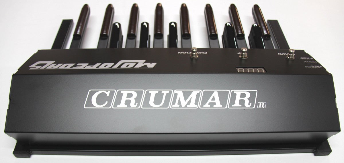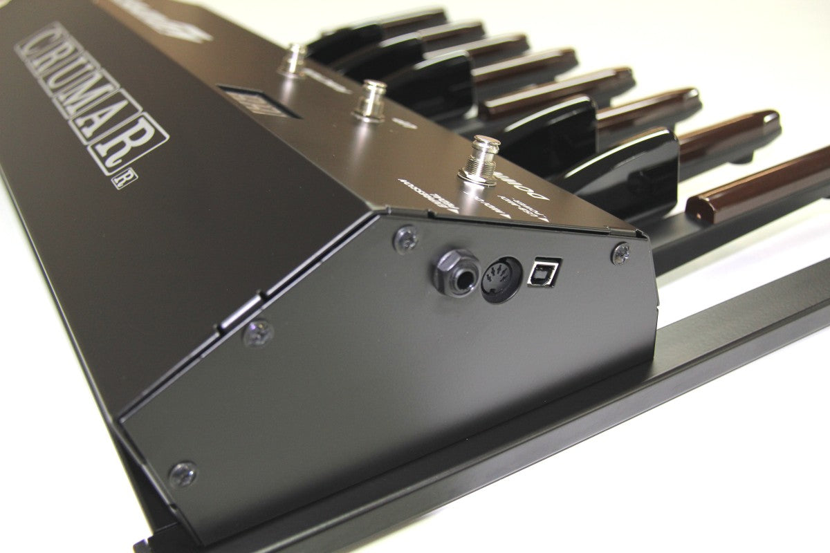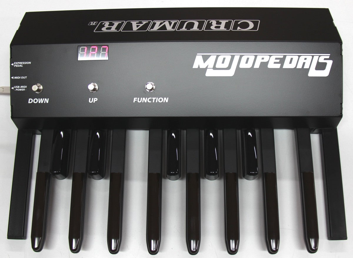 Crumar MojoPedals is a 13 note MIDI pedalboard conceived to complement the Mojo organ but can also be used as a generic MIDI pedalboard to be connected to any MIDI capable equipment. High quality metal pedals offer superior control over the playbility of the instrument: you can now expand your organ setup with this modern, lightweight accessory which offers basic but very useful functions. It is possible to select the MIDI channel, transpose by octaves or by semitones at the push of a button, send MIDI Program Change events and use the "Rotary" function to control the Rotary Simulation of the Mojo thus eliminating the need of a separate footswitch. Three LEDs visualize the current settings and the state of the Rotary control by blinking slowly or rapidly according to the current speed. A TRS connector on the rear accepts a continuous control pedal that will send MIDI Control Change number 7, useful to control the digital volume of MIDI instruments. MojoPedals, thanks to its MIDI connectivity, is compatible with virtually every existing organ, keyboard, expander or any other MIDI device. The pedals are also capable of responding to velocity in order to add a further level of expressivity. Every MojoPedals comes with a free hard case. MojoPedals Specifications: 13 note MIDI pedalboard with velocity 2 switches for value decrease/increase or for rotary speed (run/stop, slow/fast) 1 menu switch for settings or for velocity on/off: 5 options available visualized by 5 leds MIDI channel selection (from 1 to 16) Program change mode Octave selection (one down and one up) Transpose +/- 12 semitones Rotary speed function. 3 status LEDs: value down, default value, value up or run/stop, slow/fast when in rotary mode. On/off switch Connections: MIDI input MIDI output Power in 5V DC 500 mA Volume pedal compatible with pedals based on a 10 Kohm potentiometer. Other: Dimensions 57x44x15 cm Hard case dimensions 60x47x18
