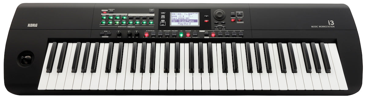 Inspiring, Intuitive, and Instant With the i3 Music Workstation, your musical themes and phrases catch fire and quickly explode into complete ready-to-play productions. Grouping sounds, beats, and parts together by Sound Set and Style Performance Set streamlines the creative process, providing a shortcut to choosing the right sounds and pulling together the right beats and grooves. On-board effects and EQ tailor the sound for any performance. The sequencer records, saves, and plays both MIDI and audio files – you can even play along. Self-contained, simple to use, and fun to play, the i3 is the ideal synth for the budding composer, the energetic performer, or the inspired up-and-coming producer. Using battery power, the KORG i3 Music Workstation can run wherever you run; a convenient auto-power off function preserves battery life. Form Follows Function The KORG i3 is a full-featured Workstation featuring 61 full-size, velocity-sensing keys. The keyboard response is adjustable using the three touch-curves; a fourth setting provides a fixed output level. OCTAVE buttons shift the pitch of the keyboard up or down by two octaves, in octave increments. The professional joystick allows real-time articulation of pitch bend, vibrato, and brilliance during performance; an additional two-band EQ (Low and High) provides a final adjustment to the overall tone. All front panel buttons and controls are conveniently grouped together by function, and the custom backlit LCD delivers valuable visual feedback regarding the instrument’s current settings. A rotary data-wheel encoder can quickly edit the value of the onscreen parameters. The black-out finish, rubberized touch surface, and perforated end panels reflect the distinctive upscale design.