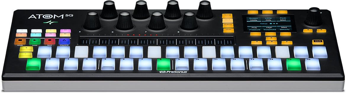 Modern musicians, performers, and producers need to move quickly from programming drums and samples to playing synth lines and back again. ATOM SQ was designed as a versatile and expressive MIDI pad controller for contemporary music production. Its unique design is optimized for both classic TR-style 16-step beat sequencing and drum pattern editing in Studio One or playing instruments and launching clips in Ableton Live—yet its staggered and RGB-lit 32-pad configuration is instantly familiar to anyone who’s played a controller keyboard. Advanced features let you change the keyboard scale, and a built-in arpeggiator and user-configurable touch strip make the ATOM SQ the most expressive controller you’ll ever use. In fact, it’s the best PreSonus Studio One MIDI controller available.