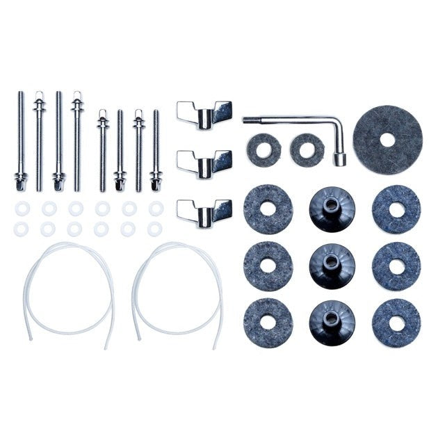 The Drummer's Survival Kit contains all the emergency items that drummers need at the gig. There are 6 cymbal felts, 3 cymbal sleeves, 2 HiHat clutch felts, 1 HiHat cup felt, 3 8mm wing nuts, 8 tension rods (4 Floor Tom and 4 Snare Drum), 12 nylon washers, drum key and 2 snare wire cords.