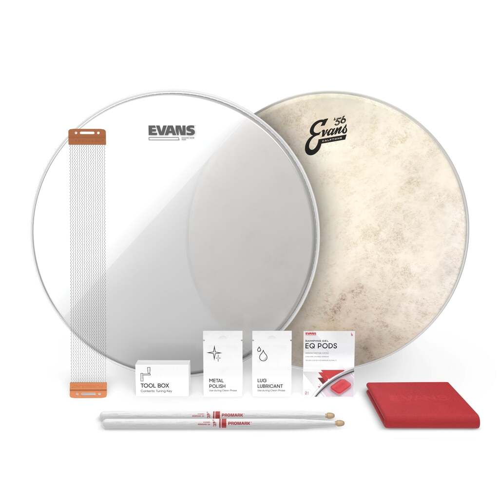 If you want the best performance out of your snare, routine tune-ups are essential. With this kit, Evans gives you the tools, materials, and instructions to modify, adjust, and holistically maintain your most essential piece of kit.Get the vintage look, sound, and feel with Calftone, alongside the complementary PureSound Concert Series 16 Strand snare wire, a Snareside 300, and a pair of Special Edition Barney Beats ProMark Rebound 5A Drumsticks.