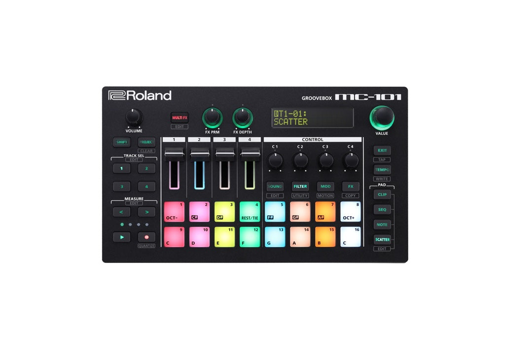 Small size. Massive groove. Produce and perform music anywhere, anytime—without clutter or complications. The MC-101 GROOVEBOX has all the high-quality sounds, sequencing, and effects of the professional MC-707, in a compact four-track version that’s go-everywhere portable. Get started with an inspiring collection of ready-to-go sounds and patterns, or easily create your own. Craft a unique style by importing custom sounds and loops that sync to tempo. And you can perform with the MC-101, triggering clips and shaping your sounds with direct, hands-on control. Pocket production studio. The MC-101 is a professional production tool, sharing the sounds and many of the capabilities of its bigger sibling, the MC-707. And there are advantages in being small. The MC-101 is solid-yet-light and runs for about five hours on four AA batteries, so you can design sounds, create drum patterns, and compose musical phrases just about anywhere. And it’s not just a scratch pad for simple ideas. You can produce fully-fledged professional tracks or create backing tracks and accompaniment for live performance. Turn a creative spark into fire. The MC-101 has a four-track sequencer optimized for creating today's electronic and dance-focused music. You can use the 16 RGB pads to create drum, bass, and synthesizer patterns and produce your own original music. Explore a musical playground, where you can freely combine loops and one-shots with melodic phrases including your own MIDI sequences and imported audio recordings. Compose and trigger clips, rearrange, re-sample, record automation, and more. A portable studio full of vintage gear. The MC-101 has the Roland sounds that have defined electronic and dance genres for over forty years. Legendary instruments like the TR-808, TR-909, JUNO-106, and SH-101 are all here, ready to replicate classic sounds or be combined, tweaked, and processed into entirely new sounds. Expandable sounds, patterns, and phrases. Compose from a curated collection of built-in beats, phrases, and sounds, all expertly crafted by renowned artists and sound designers. And the MC-101 is part of an expandable platform. So, when you're ready for more, or want to explore new genres and styles, you can easily change things up by adding new content. Play your own custom audio in perfect sync. Each track contains a powerful sample player so you can import your own custom sounds. Use your own voice, or the sound of your favorite instrument from your computer. Imported audio can sync with the MC-101's tempo or be processed with the arsenal of built-in effects and hands-on controls. Specs - Sound Generator ZEN-Core (Tone, Drum Kit) - Track Type Tone, Drum Kit, Looper (Audio Loop) - Maximum Polyphony ZEN-Core: 128 voices (varies according to the sound generator load) LOOPER: 4 (varies according to the available number of Looper track) - Tracks 4 tracks - Clips 64 clips (16 clips per track) * Clip Type: Tone, Drum Kit, Looper (Audio Loop), it varies according to the track type. - Tones Preset Tone: 3,000 or greater Preset Drum Kit: 80 or greater User Sample (as a Tone or Drum Kit): available by importing form SD CARD Looper Sample (as a clip of Looper track): available by importing from SD CARD * Available total time for User Sample: 12 minutes in mono, 6 minutes in stereo (44.1 kHz) * Available format of User Sample: WAV 32--96 kHz/16 bits, 24 bits (mono, stereo) * Available total time for Looper Sample: Approx. 60 sec (44.1 kHz) * Available format of Looper Sample: WAV 44.1 kHz/16 bits, 24 bits, 32 bits, 32 bits float (mono, stereo) - Effects Track Multi-Effects: 90 types Track EQ Chorus/Delay: 9 types Reverb: 7 types Master Effects: 90 types Master Compressor Master EQ - Step Sequencer Maximum Step: 64 steps * Available on a Tone or Drum Kit Track - Looper Time Stretch, Pitch Shift * Available on a Looper Track - Display 16 characters, 2 lines LCD (with backlit) - External Storage SD Card (SDHC supported) for saving Project Data and Audio Data - Connectors PHONES jack: Stereo miniature phone type OUT(L/MONO, R) jacks: 1/4-inch phone type MIDI (IN, OUT) connectors USB port: USB B type (Audio, MIDI) - Power Supply Alkaline battery (AA, LR6) x 4 Ni-MH battery (AA, HR6) x 4 Obtained via USB port (USB bus power) - Current Draw 500 mA - Expected battery life under continuous use Alkaline battery (AA, LR6): Approx. 3 hours Ni-MH battery (AA, HR6): Approx. 4.5 hours * This can vary depending on the specifications of the batteries, capacity of the batteries, and the conditions of use. - Dimensions 224(W) x 132(D) x 61(H) mm 8-13/16 (W) x 5-3/16 (D) x 2-7/16 (H) inches - Weight (including batteries) 716 g 1 lb 9 oz - Accessories Owner's manual Alkaline battery (AA, LR6) x 4 SD Card (installed in the product when shipped from the factory) SD Card Protector (installed in the product when shipped from the factory) Produce tracks ready to stream or perform. With the MC-101's wide range of pro effects, your music sounds polished and fully produced. Each track has independent effects processors with a huge number of variations. Lush chorus brings depth to pads and other synth sounds. Delays and reverbs create evocative spaces and add movement to delicate sequences. Overdrive, distortion, and amp simulation inject grit and intensity into synths, guitars, drums and more. You can also run your entire mix through master effects like filters, bit-crushers, and a master bus compressor that glues it all together with punch and clarity. Produce and share with the world. With a single cable. When you're ready to further develop your tracks, or share your creations with friends and fans, simply connect the MC-101 to your computer with a single USB cable. It has advanced USB audio interface capabilities and can record an entire mix or all four parts to individual tracks in your DAW. Or sample sounds from your DAW to capture backing tracks, stems, or the sound of a favorite software synth for your next live show. Specs - So