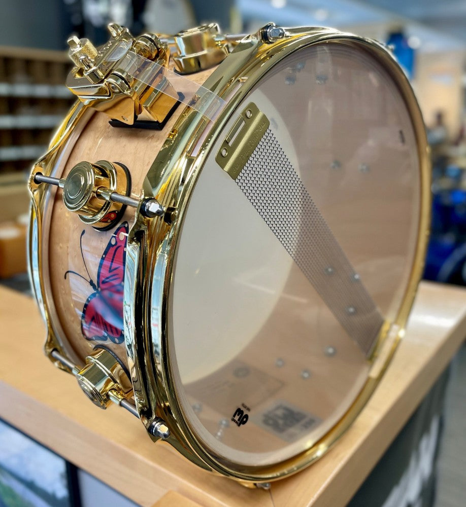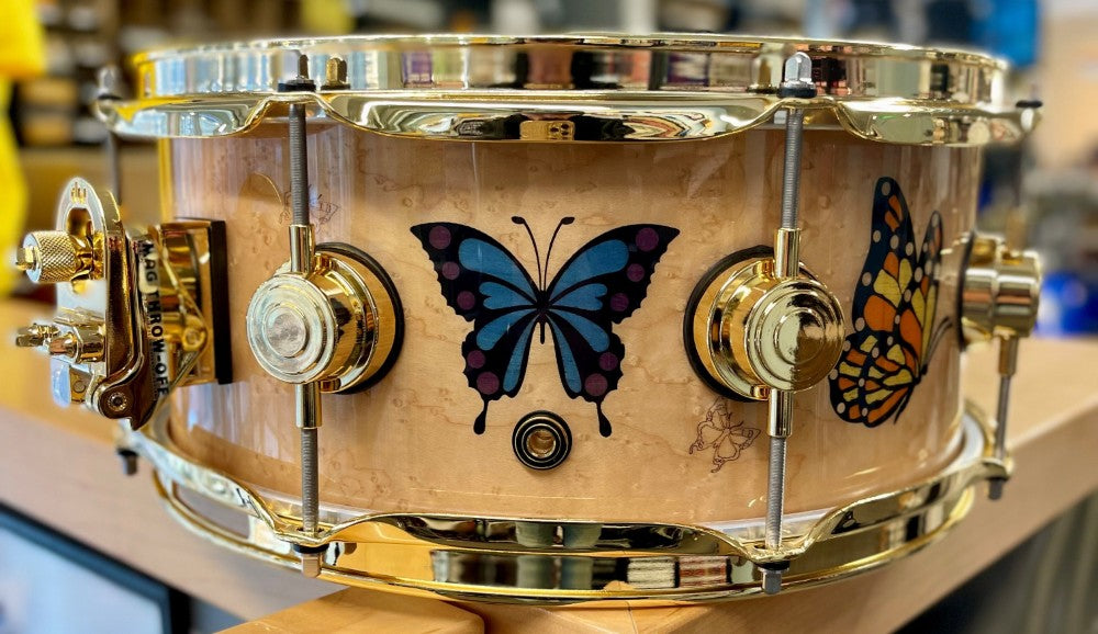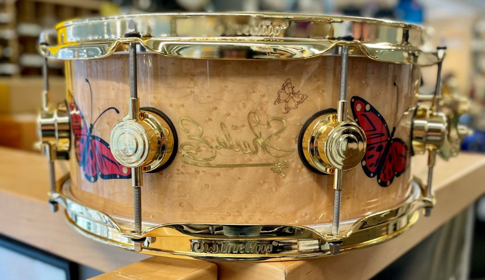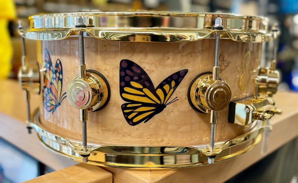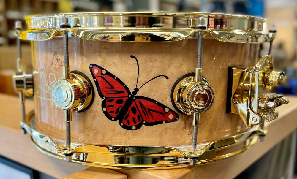DW is excited to announce the Sheila E. Collector's Series ICON Snare Drum. A groundbreaking, generational, and GRAMMY-winning percussionist, Sheila "Sheila E." Escovedo descended from the Escovedo musical family and rocketed to fame through collaborations with Prince and her seminal 1984 album, The Glamorous Life. Sheila's Icon 13" snare is built with a handcrafted 12-ply North American Hard Rock Maple shell featuring HVLT grain orientation, which is enveloped in a veneer of hand-selected birdseye Maple. The striking exterior is fitted with gold inlays of Sheila's signature backwards "E." along with a kaleidoscope of laser-cut and dyed butterflies crafted from Basswood (blue, red, and purple), Pearwood (black), and Poplar (orange). These ornate multi-colored butterflies pay tribute to a personal symbol of Sheila's musical journey. This limited-edition 5.5x13" snare drum is also fitted with premium gold DW hardware and features a patented MAG Throw-off', five-position (5P) butt plate, True-Hoops', and True-Pitch' 50 tuning rods. The resulting performance features higher tonality with a classic punchy and warm character. Only 250 units of this remarkable drum will be produced, and each includes a deluxe 13" DW snare bag and a signed certificate of authenticity from John Good. DW salutes "The Queen of Percussion," Sheila E., with this special snare drum. *