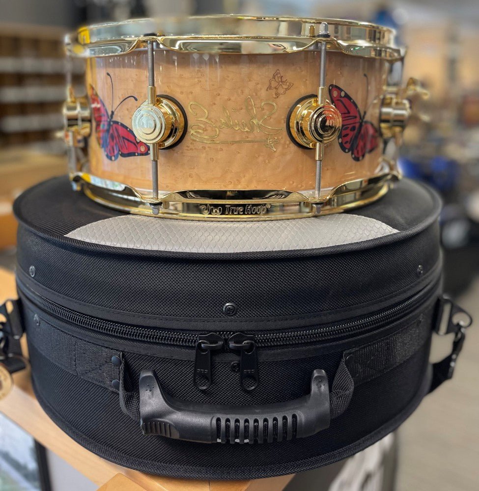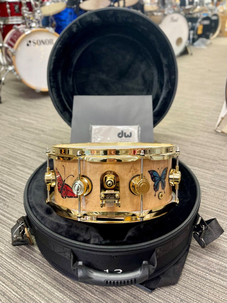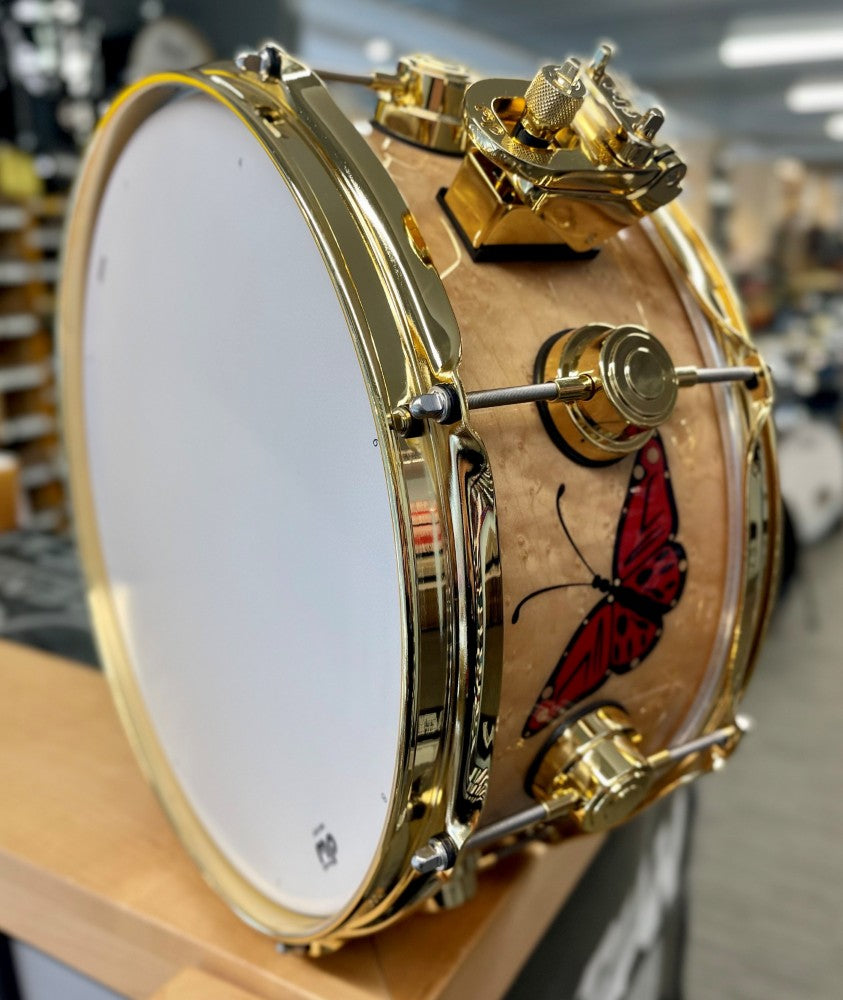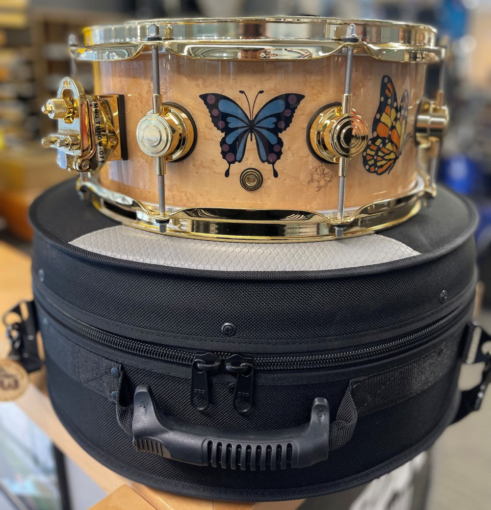 DW is excited to announce the Sheila E. Collector's Series ICON Snare Drum. A groundbreaking, generational, and GRAMMY-winning percussionist, Sheila "Sheila E." Escovedo descended from the Escovedo musical family and rocketed to fame through collaborations with Prince and her seminal 1984 album, The Glamorous Life. Sheila's Icon 13" snare is built with a handcrafted 12-ply North American Hard Rock Maple shell featuring HVLT grain orientation, which is enveloped in a veneer of hand-selected birdseye Maple. The striking exterior is fitted with gold inlays of Sheila's signature backwards "E." along with a kaleidoscope of laser-cut and dyed butterflies crafted from Basswood (blue, red, and purple), Pearwood (black), and Poplar (orange). These ornate multi-colored butterflies pay tribute to a personal symbol of Sheila's musical journey. This limited-edition 5.5x13" snare drum is also fitted with premium gold DW hardware and features a patented MAG Throw-off', five-position (5P) butt plate, True-Hoops', and True-Pitch' 50 tuning rods. The resulting performance features higher tonality with a classic punchy and warm character. Only 250 units of this remarkable drum will be produced, and each includes a deluxe 13" DW snare bag and a signed certificate of authenticity from John Good. DW salutes "The Queen of Percussion," Sheila E., with this special snare drum. *