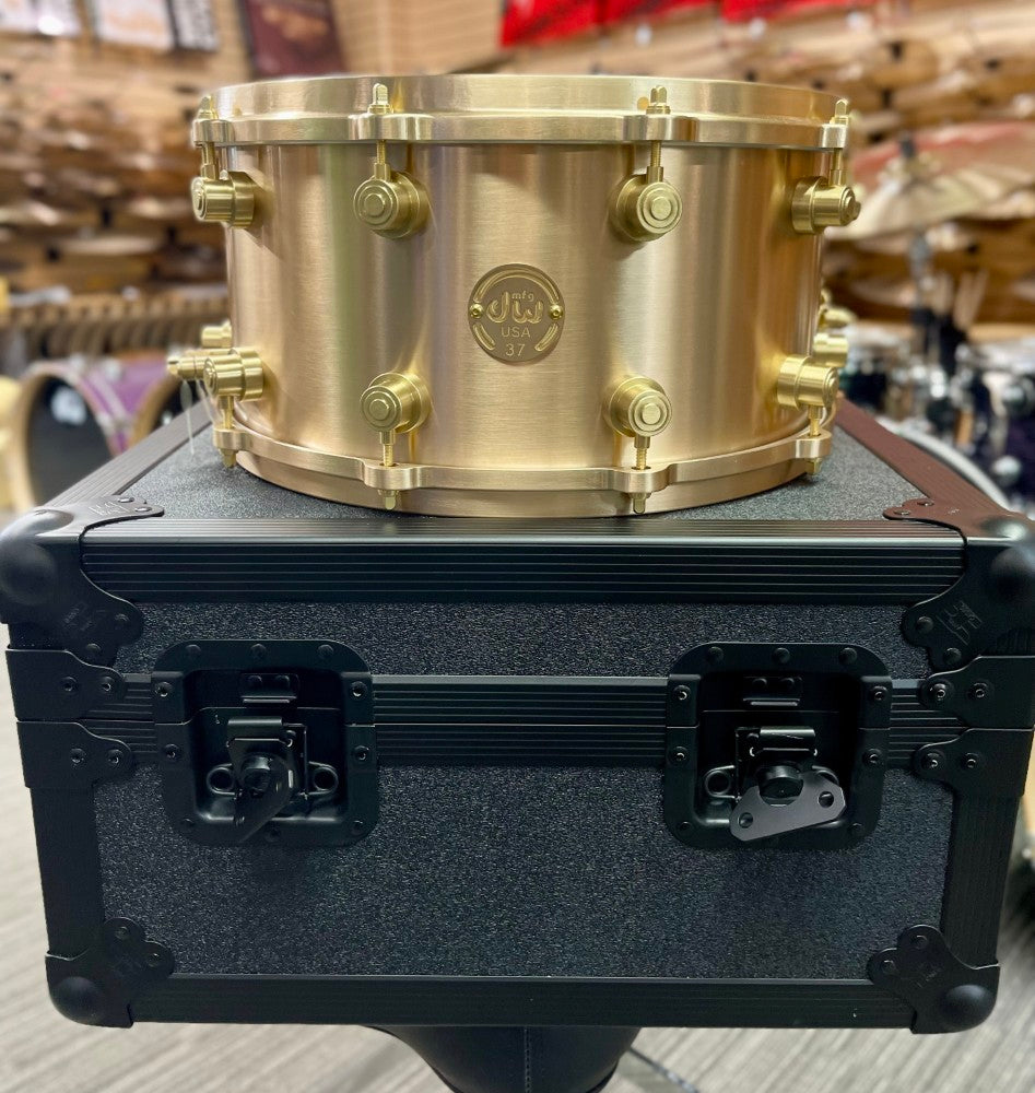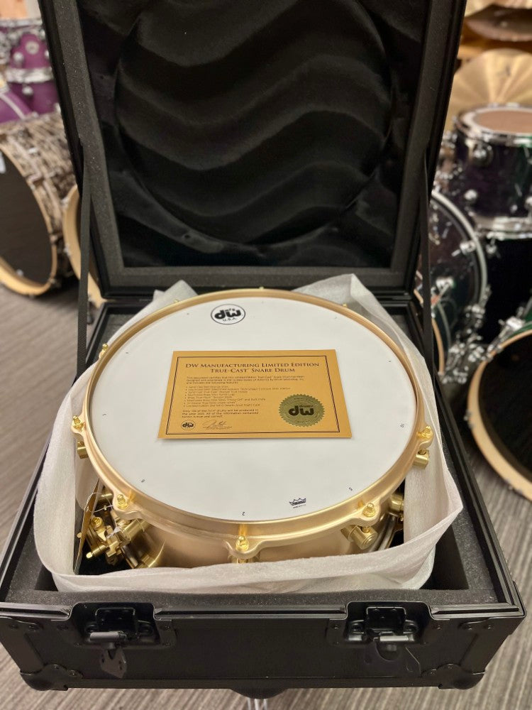 The beefy drum delivers fat, low-end punch that does not choke out at any tuning. The snare is fitted with True-Cast counter hoops, Mini Turret Lugs, Mini MAG' throw-off, and True-Pitch' tension rods, that are machined from brass to exacting standards. The drum is capped off with a 20-strand True-Tone' snare wires and Remo Ambassador single-ply snare heads with DW MFG logos. Since only 100 snare drums will be produced, each handcrafted True-Cast will include a certificate of authenticity. Also included is a limited edition DW MFG flight case that will protect the snare from the scrapes and in-transit wear from gigging.
