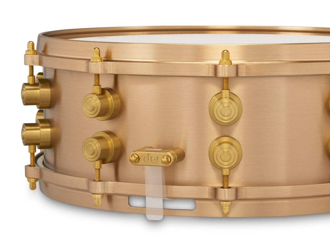 The snare is fitted with True-Cast counter hoops, Mini Turret Lugs, Mini MAG™ throw off, and True-Pitch® tension rods, that were all machined from brass to exacting standards. The drum is capped off with a 20-strand True Tone® snare wires and Remo Ambassador single-ply snare heads with DW MFG logos.