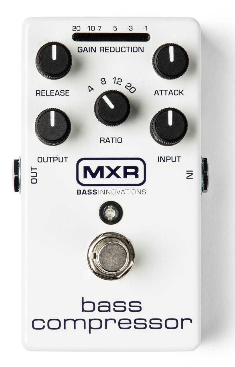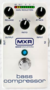 Take your favorite studio compressor to the stage with the MXR Bass Compressor. A complete array of controls-Attack, Release, Ratio, Input, and Output-makes it easy to fine-tune your sound, from subtle peak limiting to hard squashed compression effects. Its CHT™ Constant Headroom Technology gives you plenty of headroom and clear performance. This totally transparent compressor allows your full dynamic range to shine through until your signal reaches the compression threshold, which is indicated by the ten, highly visible gain-reduction status LEDs. It's all packed into a durable, lightweight aluminum-housing pedal that's the size of a Phase 90.