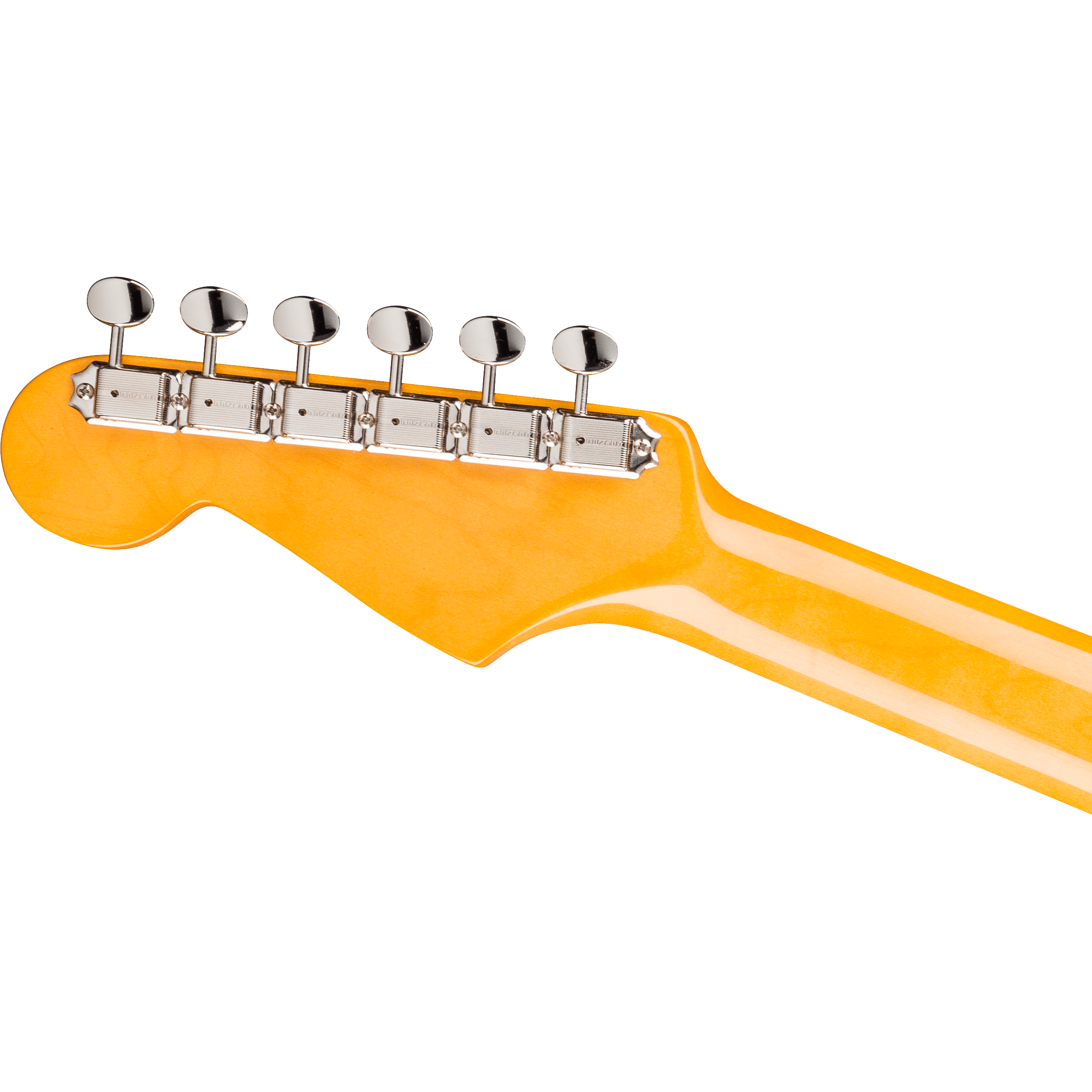 Relive the sound and spirit of 1965 with the American Vintage II 1965 Stratocaster. Smack in the middle of one of music’s most electrifying decades, the Stratocaster in 1965 was an instrument on its way to becoming rock’s greatest electric guitar. A perfect example of a Strat in a transition year, the 1965 Stratocaster® features a 1965 “C”-shaped maple neck, this time with a round-laminated rosewood fingerboard and larger pearl dot inlays. Other authentic features include an 11-hole three-ply white pickguard, the incredibly cool transition logo with larger lettering, and a set of amazing “gray bottom” Pure Vintage 1965 pickups.
