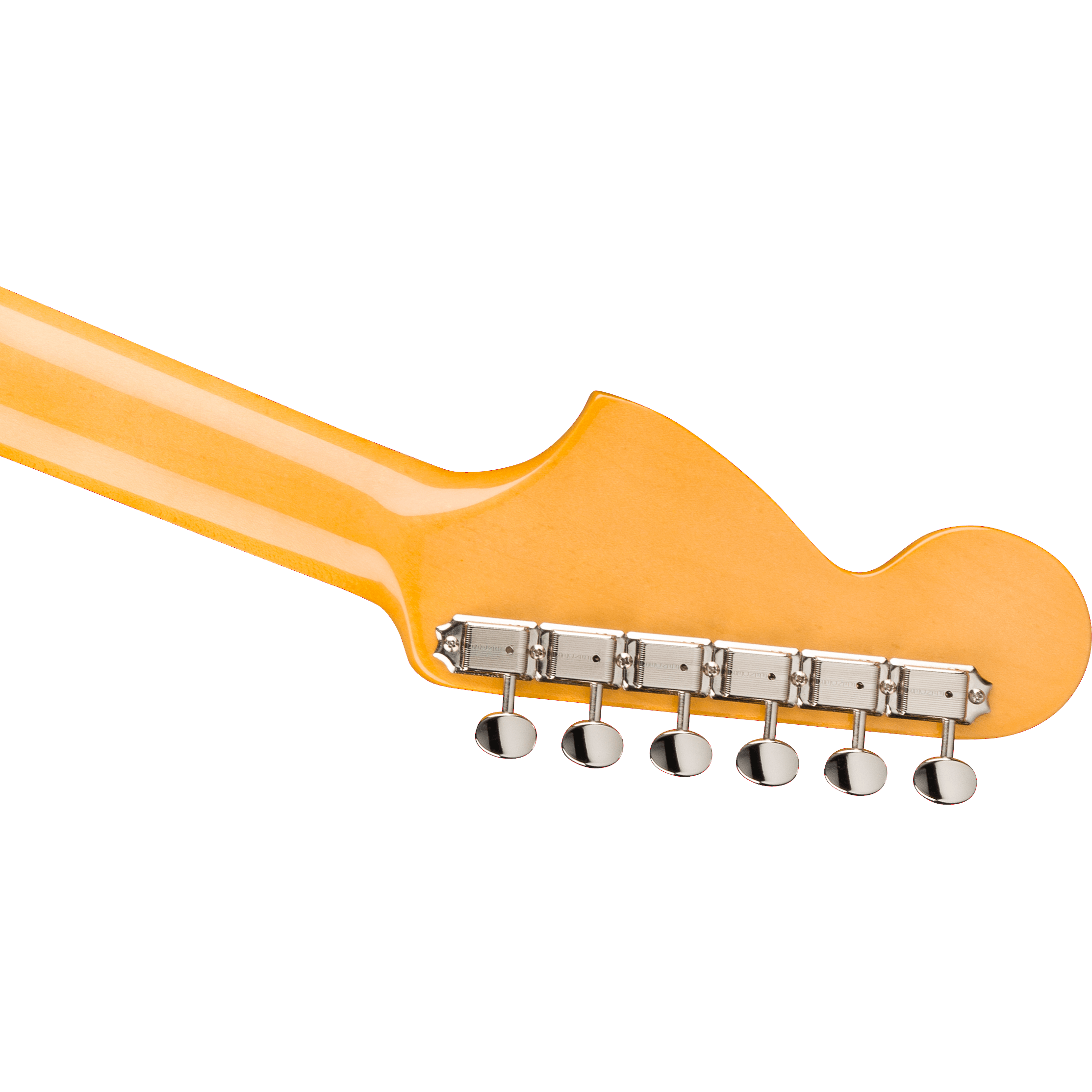 The American Vintage II 1966 Jazzmaster features a comfortable ""C"" shape maple neck that plays like a dream with a 7.25"" radius round-lam rosewood fingerboard and vintage tall frets. Characteristic of production in 1966, this guitar is offered with white neck binding, pearl blocks, single-line ""Fender Deluxe"" tuners and matching painted headstock (on custom colors only). The patented ""floating"" tremolo, adjustable bridge with threaded saddles and Pure Vintage '66 Jazzmaster pickups, wired to the signature rhythm and lead circuits, deliver classic tone and authentic Fender feel.