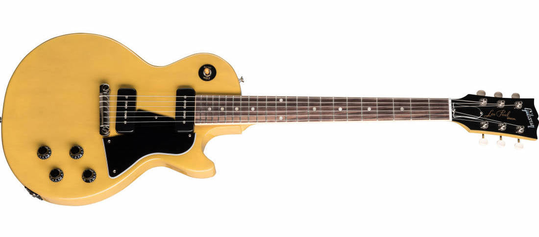The new Les Paul Special TV Yellow returns to the classic design that made it relevant, played and loved shaping sound across generations and genres of music. It pays tribute to Gibson's Golden Era of innovation and brings authenticity back to life. Originally introduced in 1955, the Les Paul Special has been embraced by musicians for over 60 years. It is based on the Les Paul Junior with a slab mahogany body, fat 50s-style mahogany neck, rosewood fingerboard, wraparound bridge, an additional rhythm P-90 pickup, binding on the neck and additional controls for the rhythm pickup and the 3-way toggle switch.