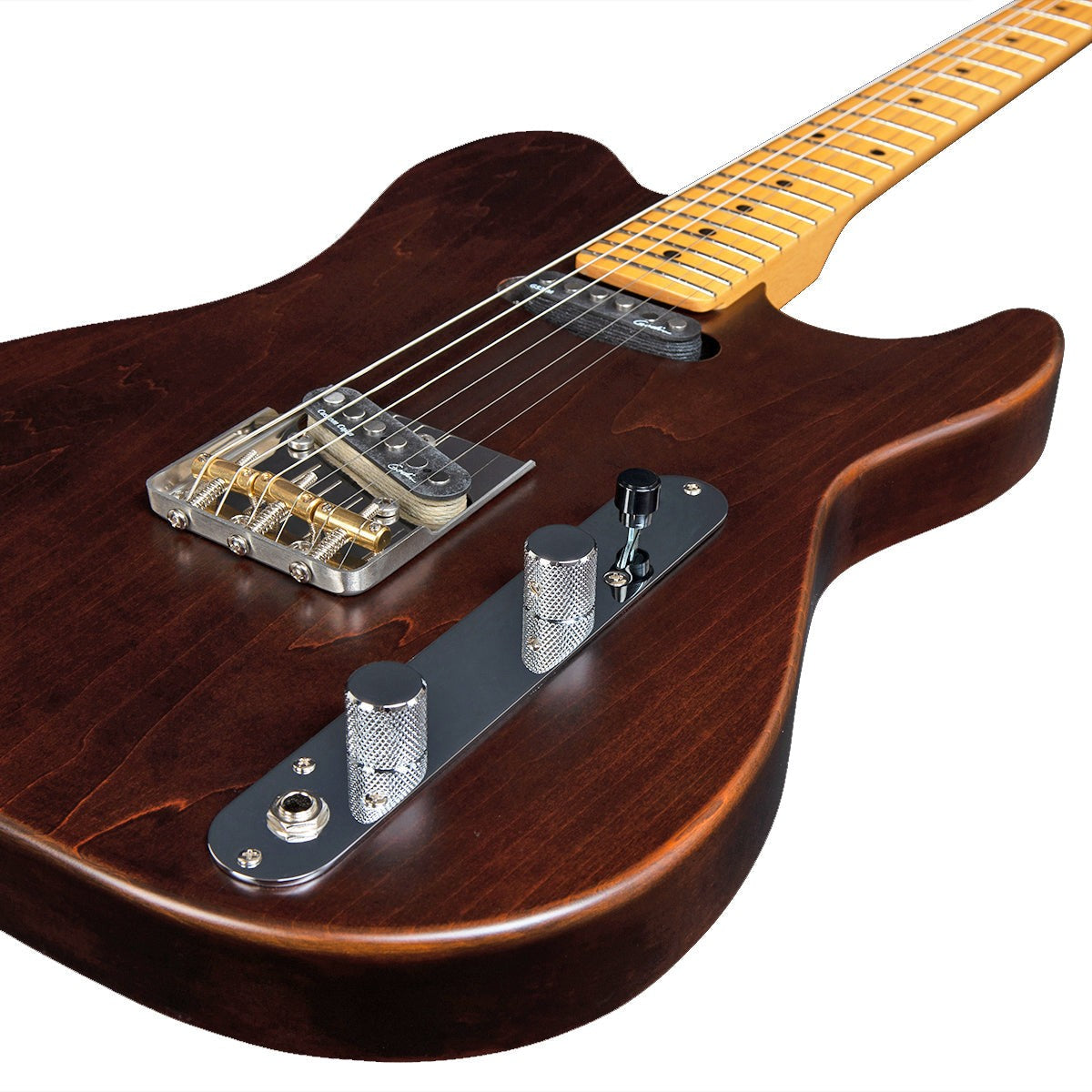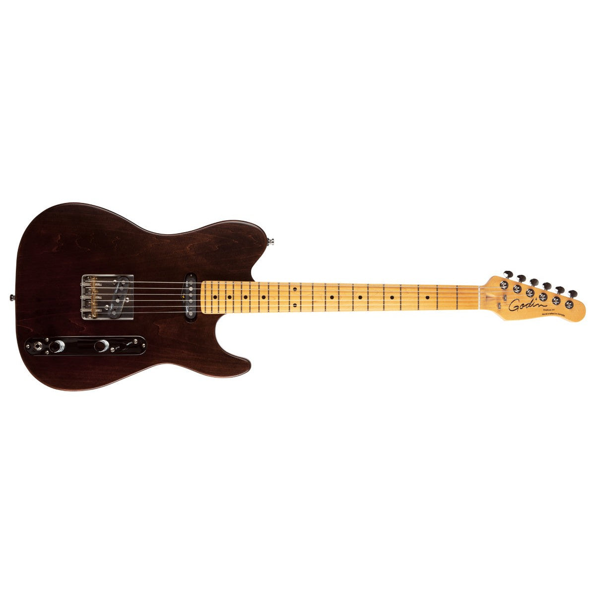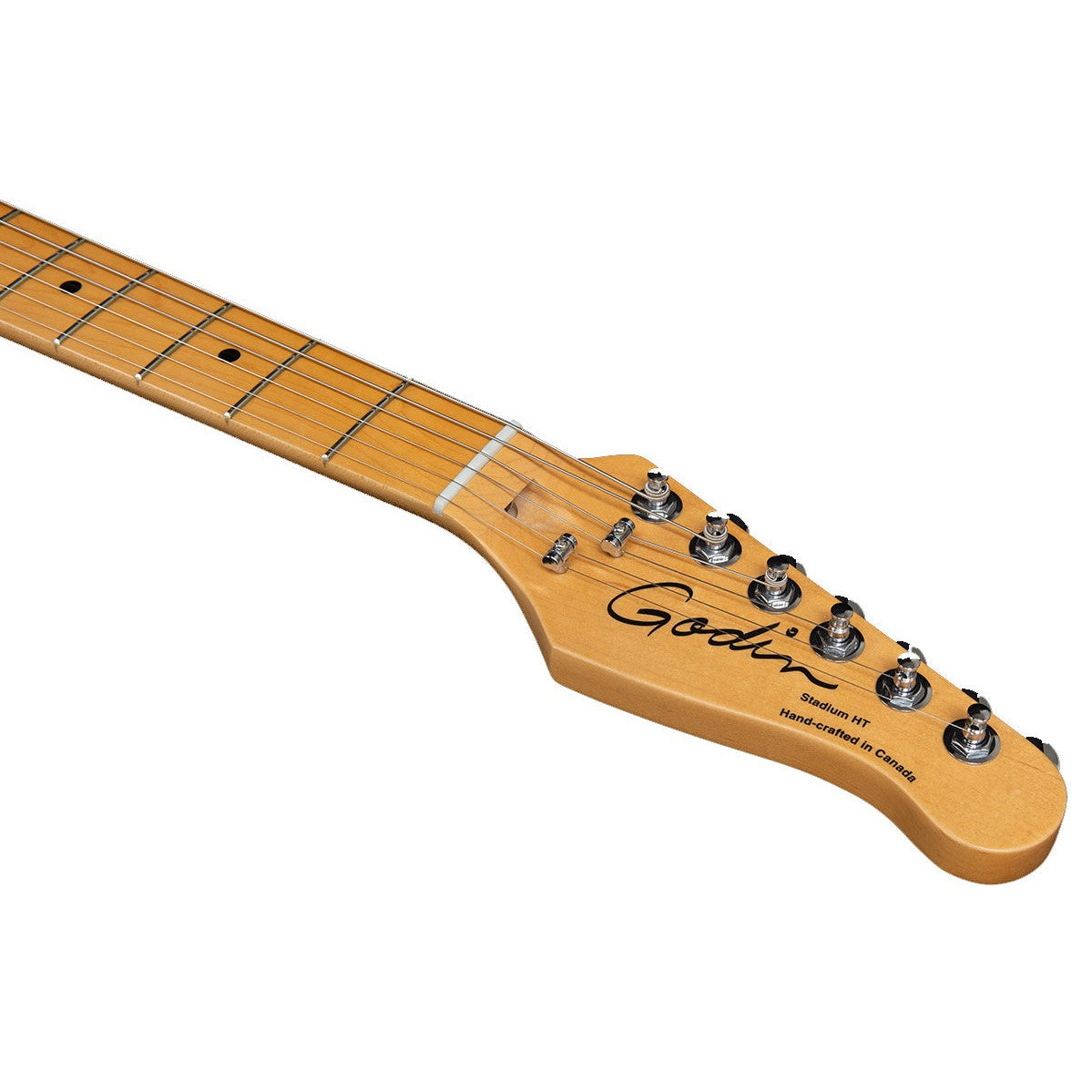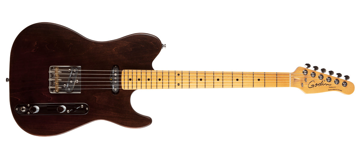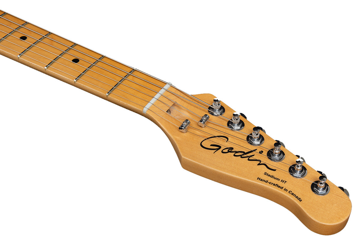 Rule the stage with the Stadium HT! This modern single-cut axe sets itself apart with looks and features that call out to the true musician in all of us. Take hold of the silky feel of the Stadium HT Hard Rock Maple Neck and see how quickly your fingers start doing the talking with inspired licks and riffs. The super light Canadian Laurentian Basswood string-through body is balanced, expressive, and smoothly finished. Speaking of finish, each Stadium HT has a unique acoustic-inspired finish that gives the body a vintage look and feel, all the while allowing it to breathe and resonate more freely, and genuinely age and wear as you play for it that weathered look, like that comfy old pair of jeans. Great sustain and tone come standard with the Custom T-Ashtray Hardtail Bridge complete with brass saddles, and notes are expressive via the Custom Godin Cajun at the bridge and Godin GS-3 at the neck. Adding to the vintage vibe with a modern twist is the reinvented vintage-style control plate, complete with Volume, Tone, and slanted 3-Way Switch—aligned with the natural sweep of your right hand for easy pickup selection. The Stadium HT comes in 3 awe-inspiring finishes: Trans White, Matte Black, and Havana Brown. Specs Body:Canadian Laurentian Basswood Neck:Hard Rock Maple Fingerboard:Maple Fingerboard Radius:12" (304.8 mm) Scale Length:25.5" (647.7 mm) Nut Width:1.65" (41.91 mm) Nut Type:Graphtech Frets:22 Machine Head Ratio:18:1 Neck Pickup:Godin GS-3 Single Coil Pickup Bridge Pickup"Godin Custom Cajun Single-Coil Bridge and Tailpiece:Custom T – ashtray bridge w/brass saddles Controls:1x Tone, 1x Volume, 3-way Switch H.D.R:Not Included Color:Havana Brown Finish:Semi Gloss String Set:E10 String Guages:.010 .013 .017 .026 .036 .046 Case:Gig Bag