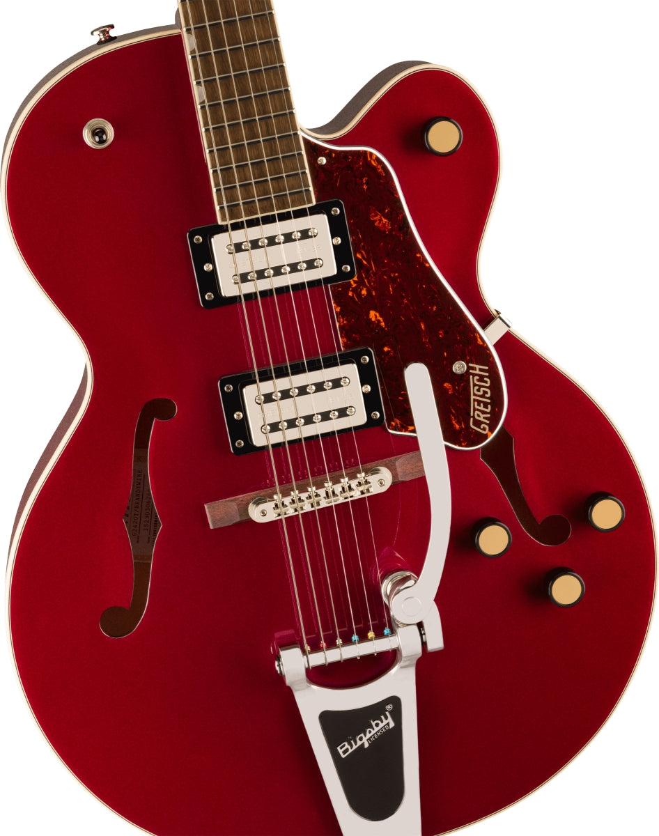 The G2420T Streamliner Hollow Body Single-Cut with Bigsby® features a fully hollow arched maple body with parallel tone bars for rich fullness, deep resonance and "big-body sound."
