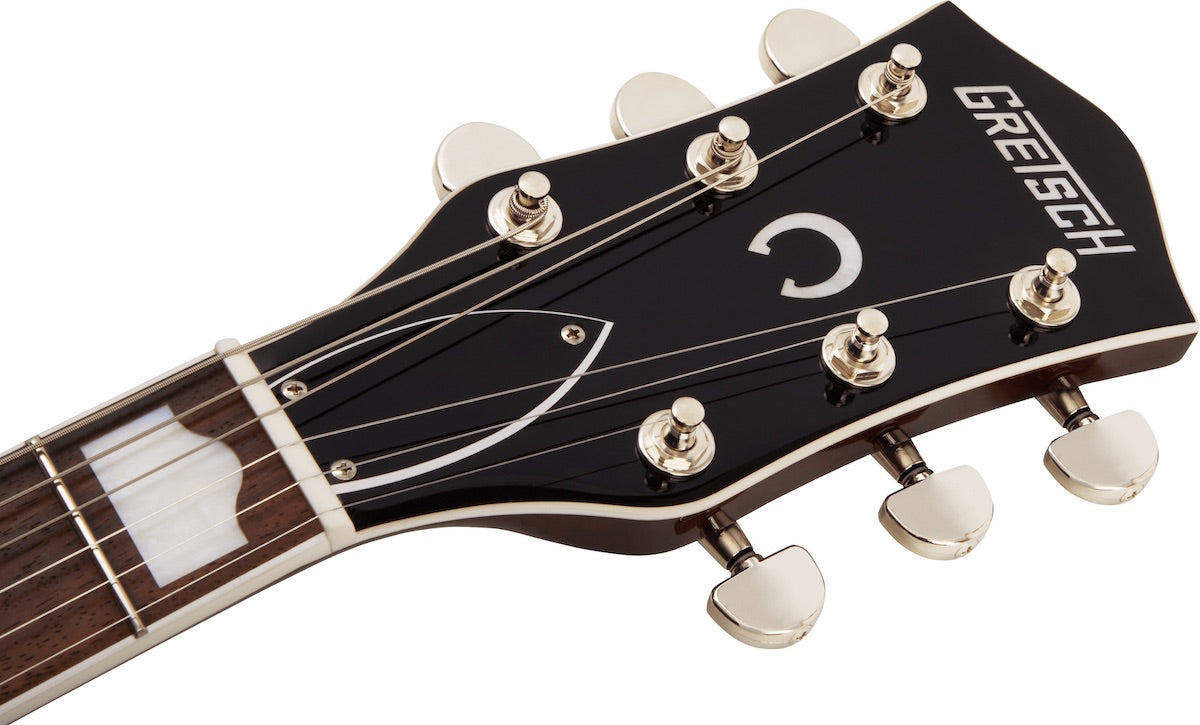 Other features include a maple set neck, 12”-radius rosewood fingerboard with pearloid Hump Block inlays, bone nut, G-arrow knobs, Bigsby® vibrato tailpiece, Adjusto-Matic™ bridge with pinned rosewood base and Gotoh® tuners.
