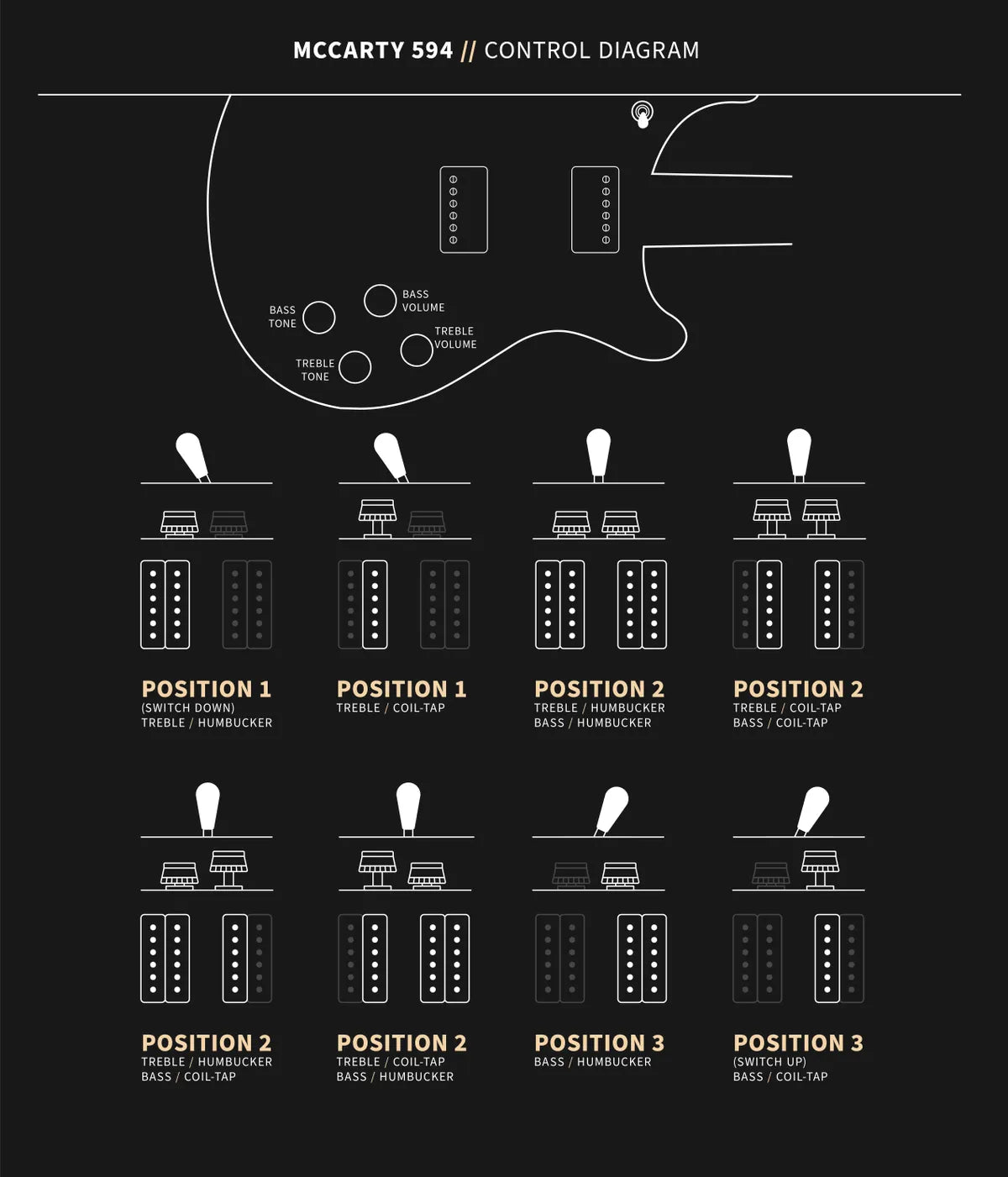 - The McCarty 594 is a versatile, vintage-inspired instrument with modern playability and reliability. Featuring a bound 22-fret Pattern Vintage neck and slightly thicker back for more enhanced tone and sustain, the McCarty 594 plays in tune, is intonated the entire length of the neck, and feels like a guitar you’ve been playing forever. Whether you are looking for rich, authentic humbucking tones or nuanced, sweet single-coil sounds, the McCarty 594 can seamlessly master both sonic territories thanks to its McCarty III pickups and dual volume and push/pull tone controls.