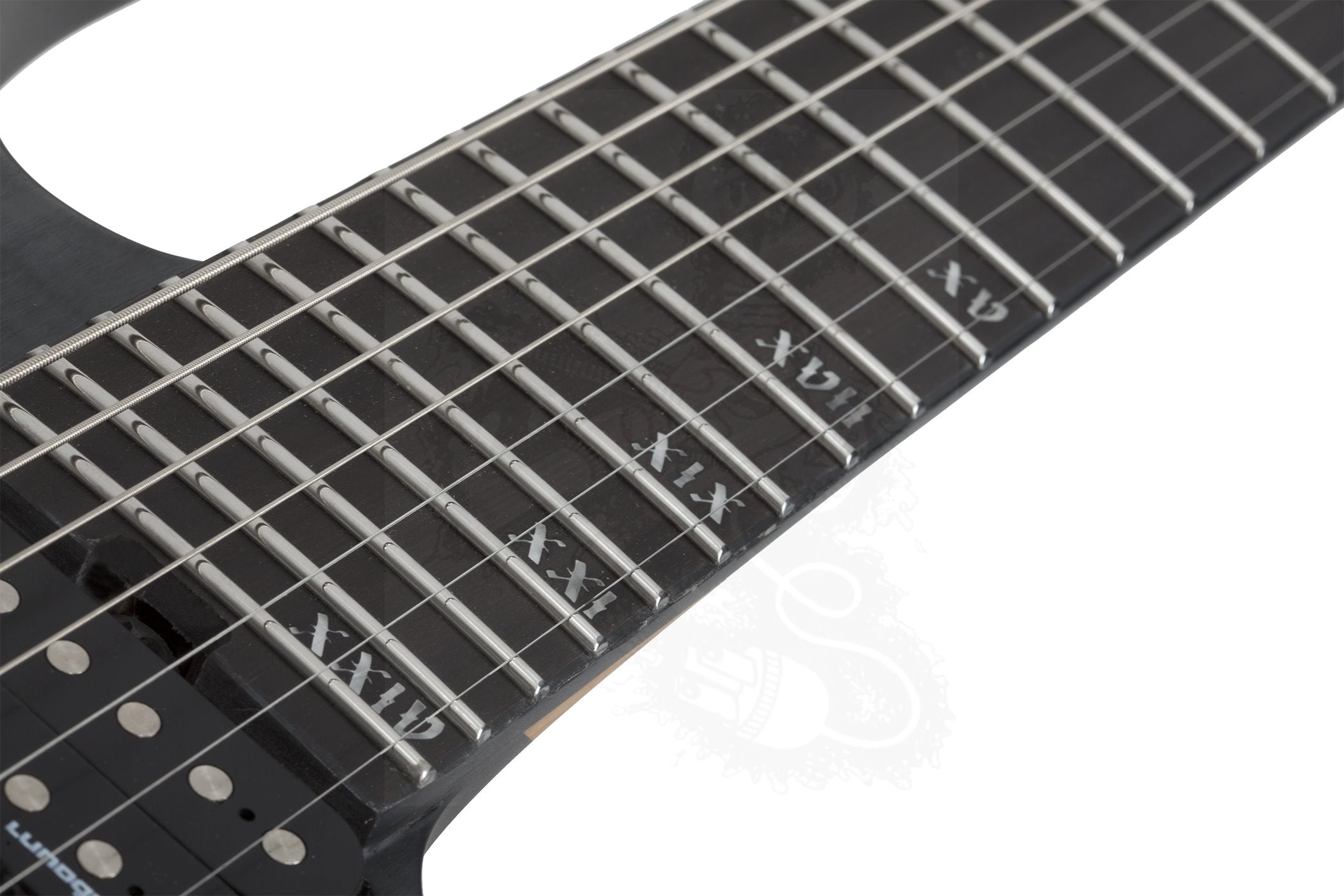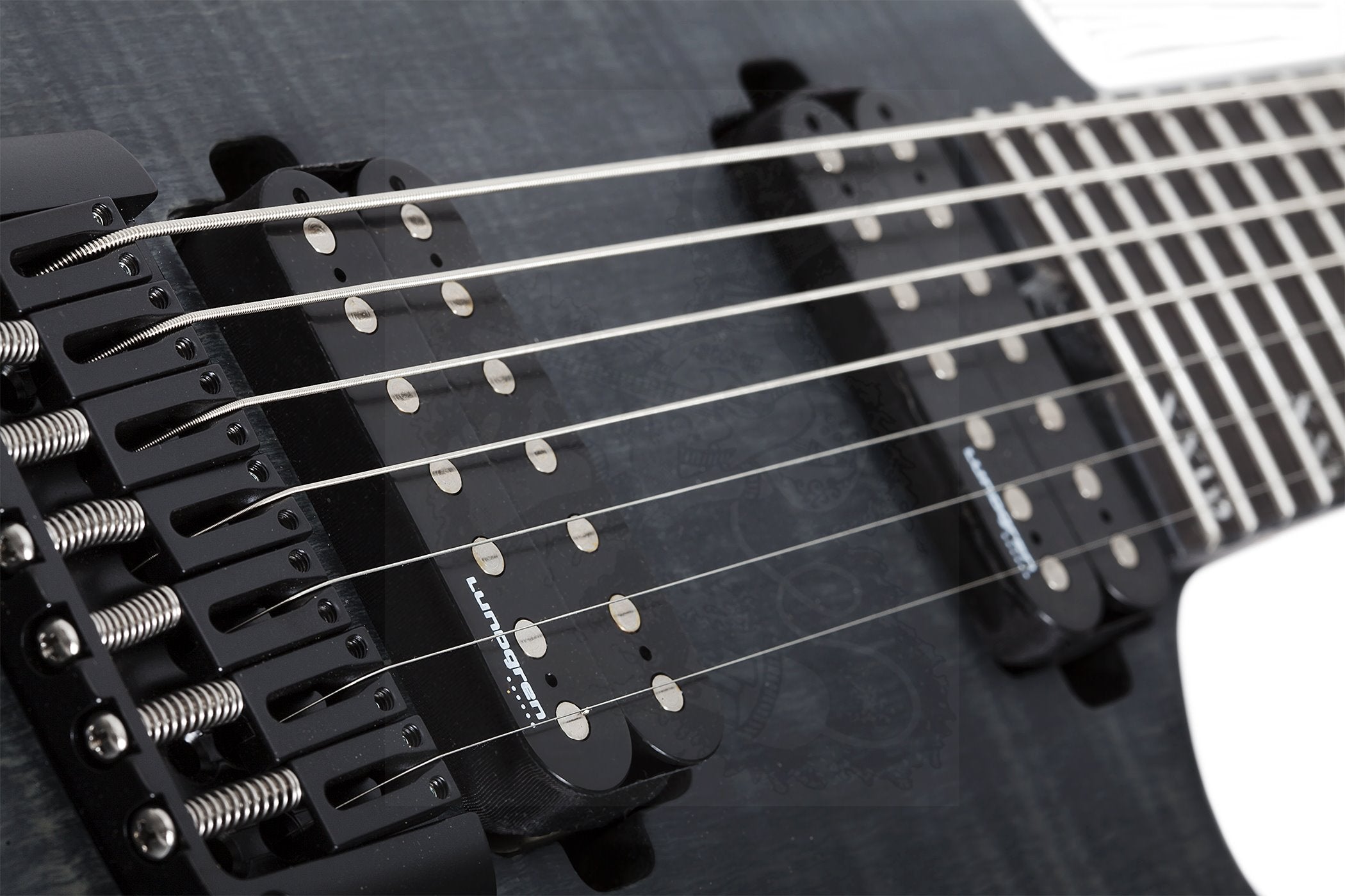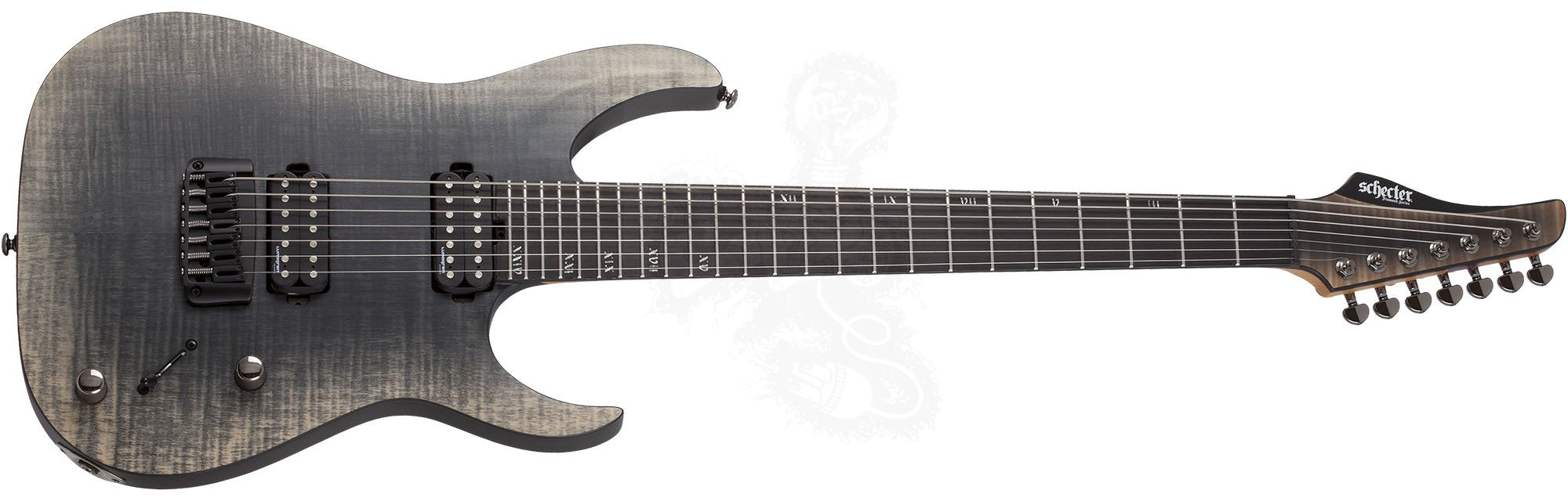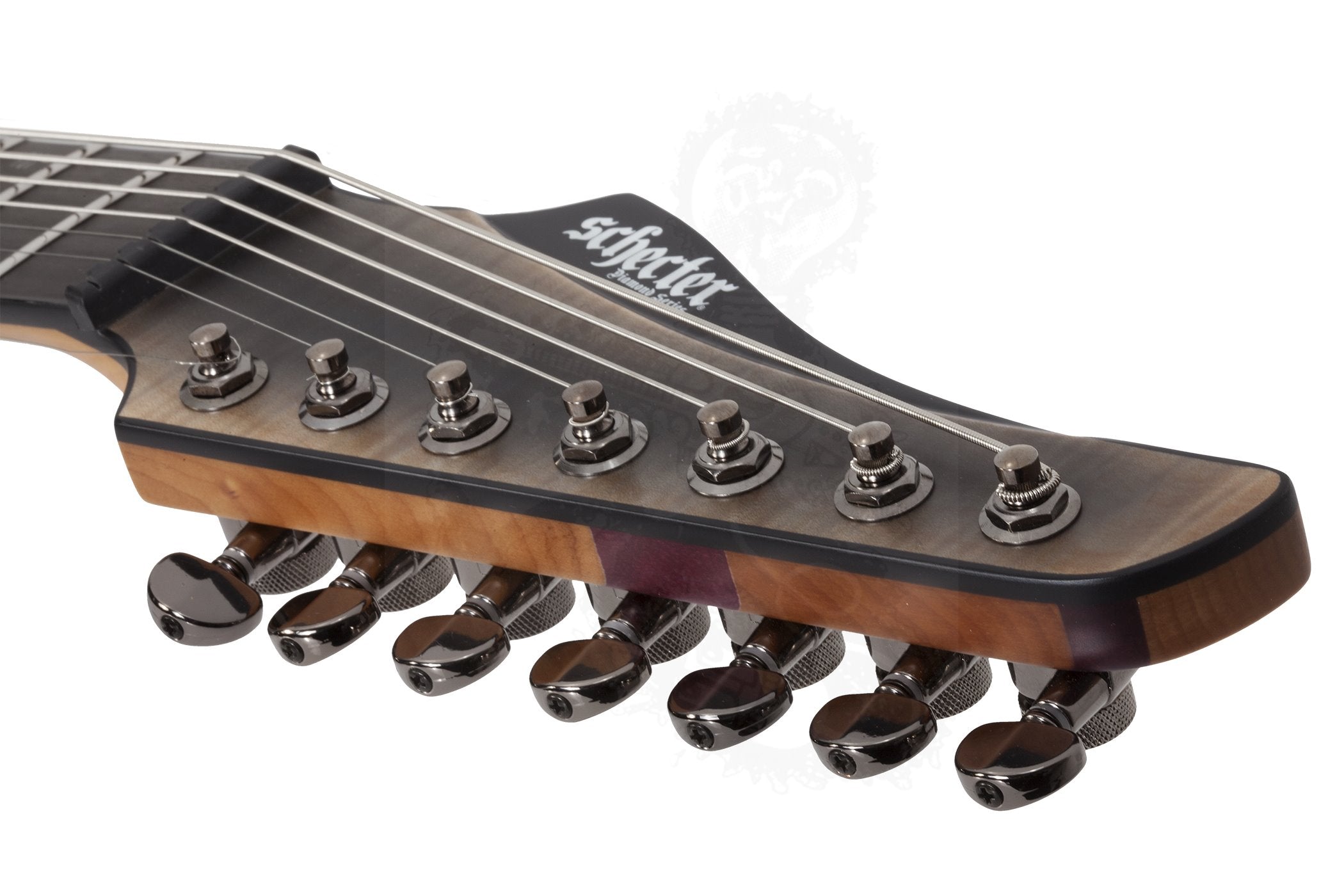 Neck Tuners: Schecter Locking Fretboard: Ebony Neck Material: Roasted Maple/Purpleheart Multi-ply with Carbon Fiber Reinforcement Rods Inlays: Offset/Reverse Roman Numerals Side Dot Markers: Luminlay Glow in the Dark Scale: 26.5” (673mm) Neck Shape: Ultra Thin ‘U’ Thickness: @ 1st Fret- .748” (19mm)/ @ 12th Fret- .787” (20mm) Frets: 24 X-Jumbo Stainless Steel Fretboard Radius: 12”-16” Compound Radius Nut: Graph Tech XL Black Tusq Nut Width: 1.889” (48mm) Truss Rod: 2-Way Adjustable Rod w/ Heel Access Spoke Wheel Body Guitar Colors: Fallout Burst (FOB) Hardware Color: Black Chrome Top Contour: Radius Top Dexterity: Right Handed Construction: Neck-Thru w/Ultra Access Body Material: Swamp Ash Top Material: Flamed Maple Binding: Black 1-ply Bridge: Hipshot Ibby HM Guitar Bridge Electronics Controls: Volume/Tone (Push-Pull)/3-Way Switch Bridge Pickup: Lundgren M7 Neck Pickup: Lundgren M7 Accessories Knobs: Metal Knurled w/ Set Screw Strings: Ernie Ball 7-String (.009/.011/.016/.026/.036/.046/.062) Case: SGR-1C "Case Sold Separately"