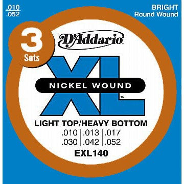 EXL140 is one of DAddarios most popular hybrid sets, combining the high strings from an EXL110 (.010) with heavier low strings (.052). This combination delivers powerful low end for heavy chording and flexible plain steel strings for bending. Optimized for down or drop tuning!