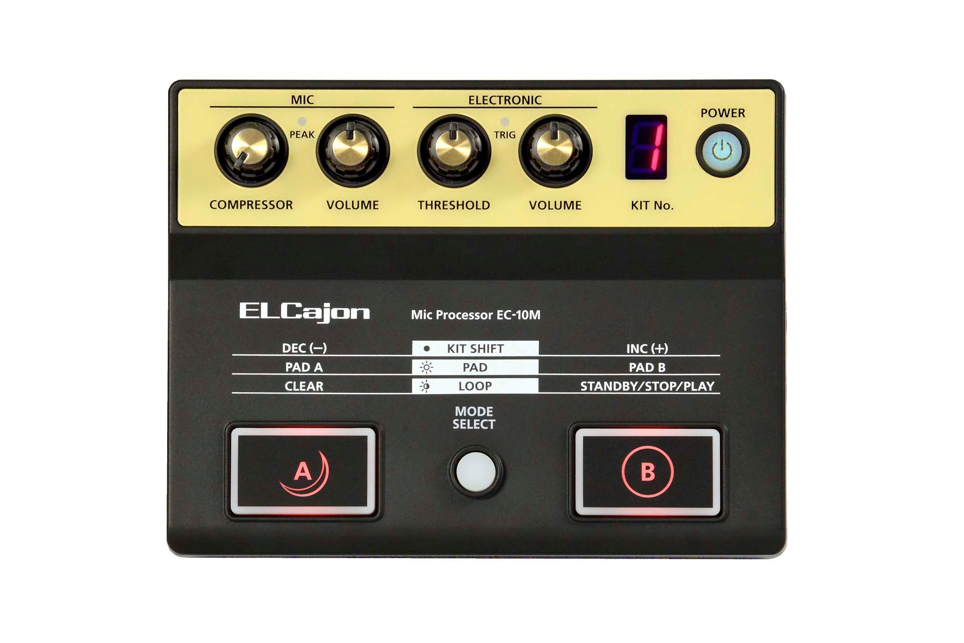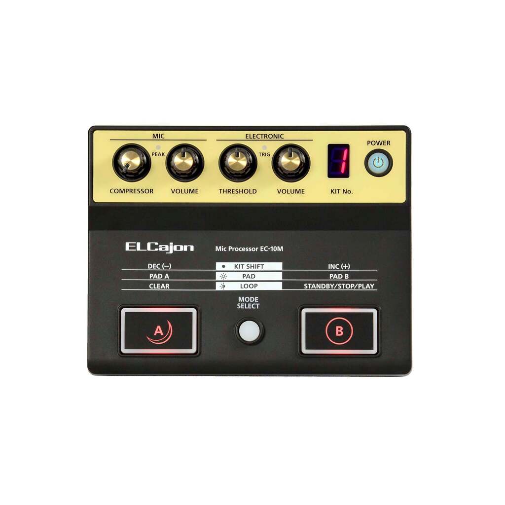 The EC-10M ELCajon Mic Processor is a totally unique and innovative creative tool designed for the acoustic cajon. Compact and battery powered, the EC-10M picks up the cajon’s acoustic sound with the included clip-on condenser mic, which is also used to trigger a variety of onboard tones for layering with the acoustic voice. You can then send both sounds to an amp or PA, giving you complete control over your stage sound. It’s also possible to create percussion phrases with a built-in looper, and play additional sounds via integrated A/B foot pads or optional kick trigger pedals. Everywhere you play, the EC-10M transforms the acoustic cajon experience with a world of new expressive power.