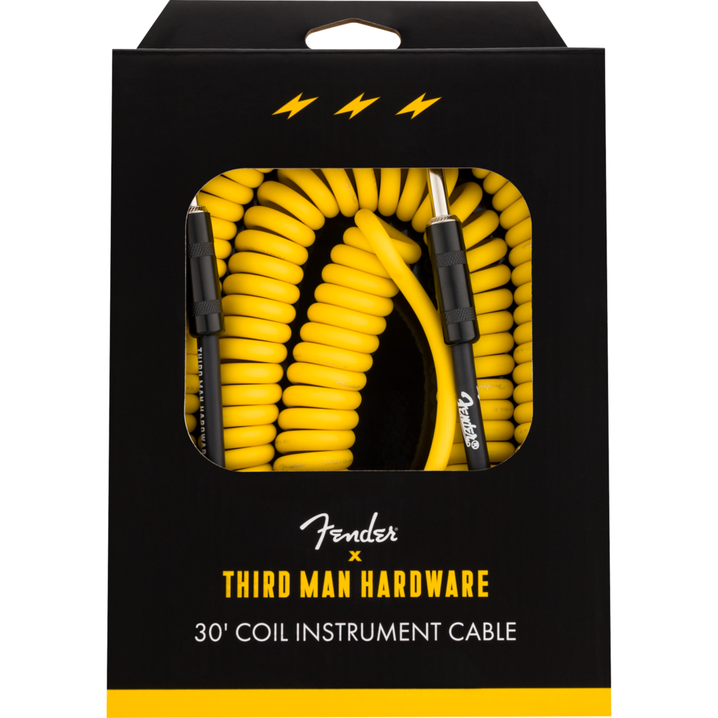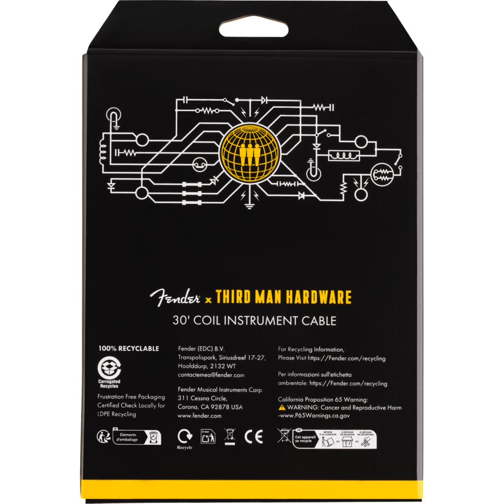 The Fender® x Third Man Hardware™ 30’ Coil Cable combines high-performance design with retro-inspired style. Featuring spiral shielding and durable nickel-plated connectors, this cable delivers reliability in the studio or on stage. Drawing inspiration from Third Man's bold aesthetic, the cable features a striking yellow PVC jacket and custom ends featuring the Third Man Hardware logo, adding a vintage flair to your setup. With its exceptional sound quality and timeless appeal, the Fender x Third Man Hardware Coil Cable brings a touch of Jack White’s legendary look to your performance.