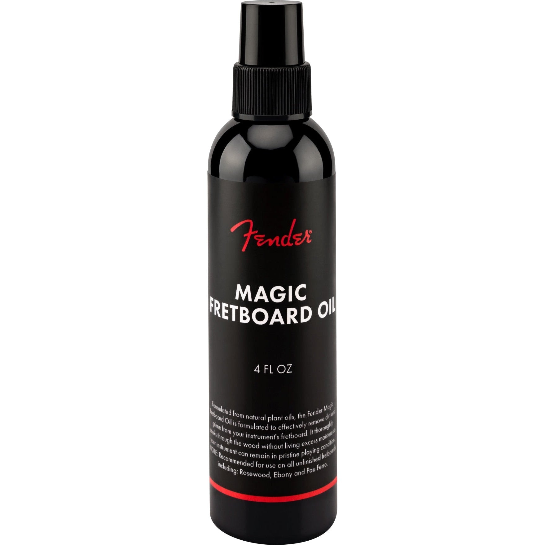 Formulated from natural plant oils, the Fender Magic Fretboard Oil effectively removes dirt and grime while leaving your instrument’s fretboard good as new. It thoroughly soaks through the wood without living excess moisture so your instrument can remain in pristine playing condition. This fretboard oil is free of any lemon oil extracts, which can be known to dry out the fretboard and potentially break down adhesive material keeping the frets and fretboard binding in place, resulting in more frequent maintenance required. NOTE: Recommended for use on all unfinished fretboards including: Rosewood, Ebony and Pau Ferro.