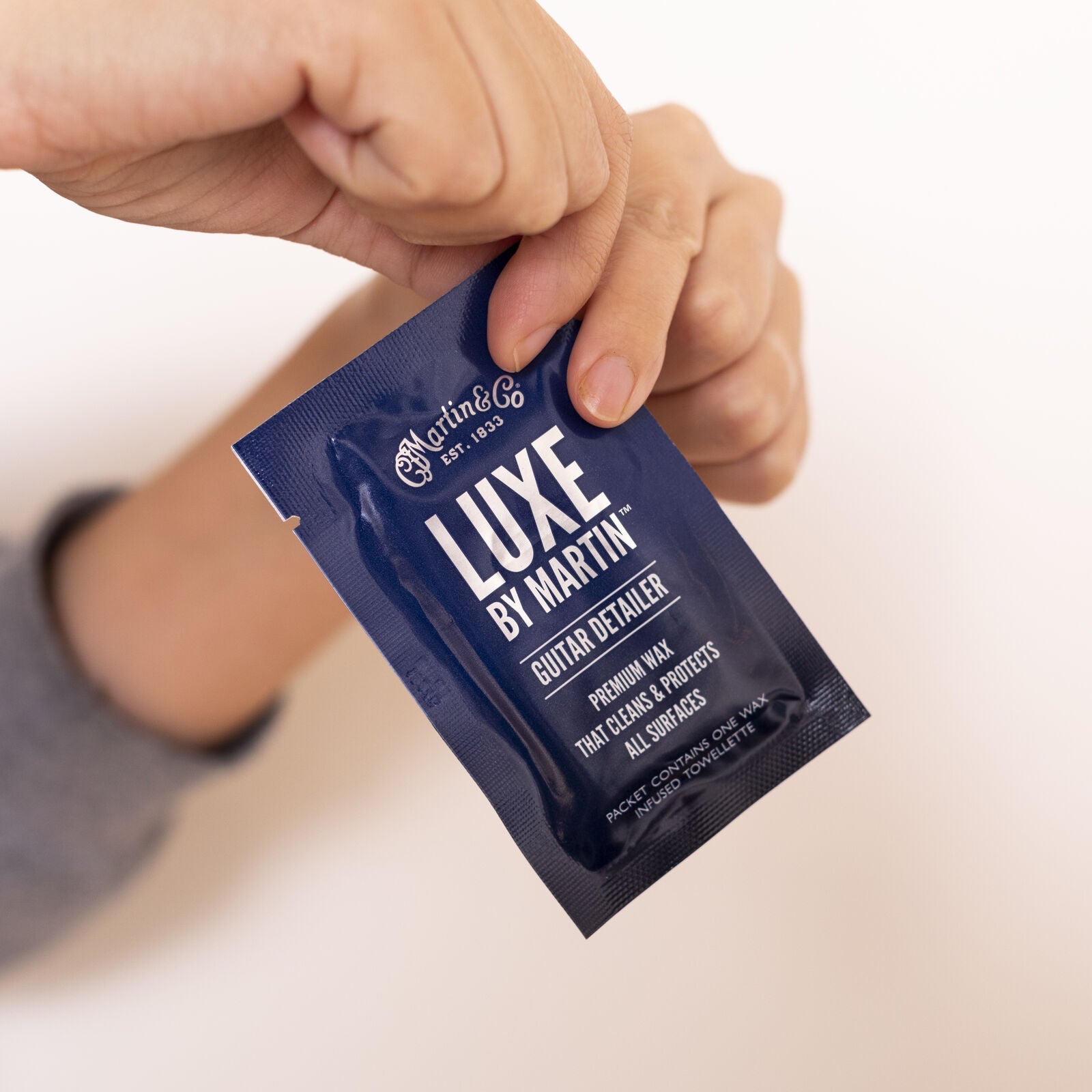 LUXE BY MARTIN® Guitar Detailer is a premium wax that cleans and protects all surfaces of guitars. Developed exclusively with Zymöl™. This ultimate natural cleaner and protectant comes in a quick, easy to use single use packet containing a wax infused towelette. Formulated with all natural ingredients this cleaner-wax combo is safe for all guitar surfaces. Bring home the product used and approved at Martin’s factory and care for your guitar with the very best.