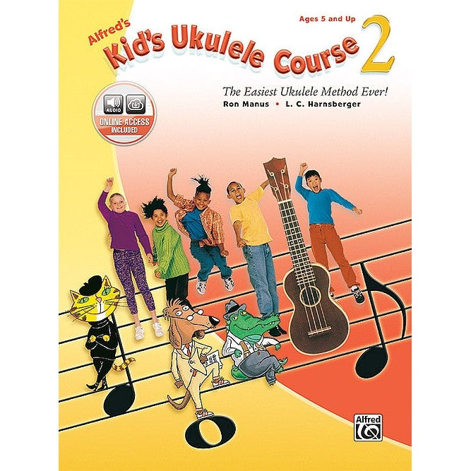 The easiest ukulele method ever for kids ages 5 and up. This fun method teaches you to play songs on the ukulele right away. The accompanying online audio lets you hear how the music should sound on any computer or handheld device. Three irresistible ukulele experts guide students along---a clever, classical dog, one cool jazz cat, and a friendly alligator who loves the blues. They draw attention to what's important on each page and make learning music fun! Parents can be effective guides through this course, even if they've never had any musical training. This course is also perfect for the classroom. Book 2 picks up where Book 1 leaves off and teaches new songs, including "Old MacDonald Had a Farm," "Aura Lee," "A-Tisket, A-Tasket," and many more.