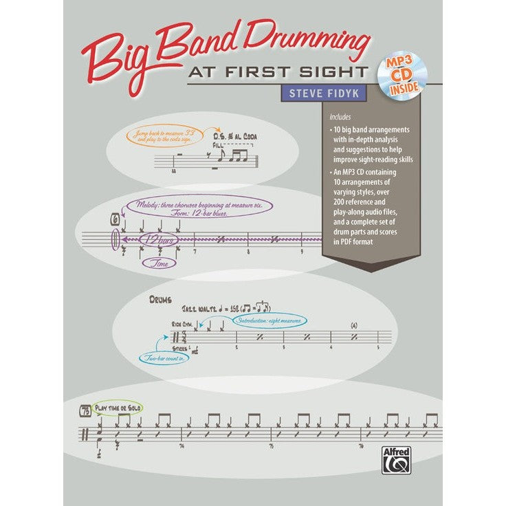 With Big Band Drumming at First Sight, Steve Fidyk offers a comprehensive approach to improve sight-reading skills in a big band setting. With advice on how to accompany different musical forms and playing styles, Fidyk gives detailed information that will strengthen your ability to recognize band figures and beat patterns quickly and easily. The companion play-along MP3 CD features 10 arrangements of varying styles with beat and figure examples extracted from each score that are looped or repeated several times for thorough study. Big Band Drumming at First Sight will be an invaluable tool in helping you to become a better sight-reader! Read, listen, study, and learn through Steve's experience on what it takes to look at a drumset part once, and know how to deliver the musical goods with confidence!