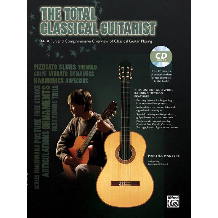 The Total Classical Guitarist teaches the essentials of classical guitar from beginning levels to late intermediate. This exciting method features in-depth lessons on right- and left-hand technique, posture, ornaments and slurs, performance aesthetics, fingernail care, and much more. Intended for those with some experience playing guitar (not the absolute beginner), this book will appeal to traditional classical guitarists and teachers---as it features examples written in standard music notation only (no TAB). A CD demonstrating all of the examples in the book is included.