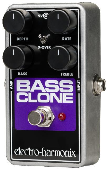 The Bass Clone chorus pedal’s core circuitry is nearly identical to the legendary Small Clone chorus, but with added features especially for bass. Chorus is a combination of modulated and dry signals. The Bass Clone’s Crossover switch cuts low end from the modulated signal so the pedal delivers a more accurately articulated bottom end with excellent note definition. The Treble control affects the whole signal while the Bass control only affects the dry half. Together with the Crossover switch they provide precise sound shaping that lets you achieve a tight, focused bass guitar sound with a well-defined low end and shimmering chorus on top.