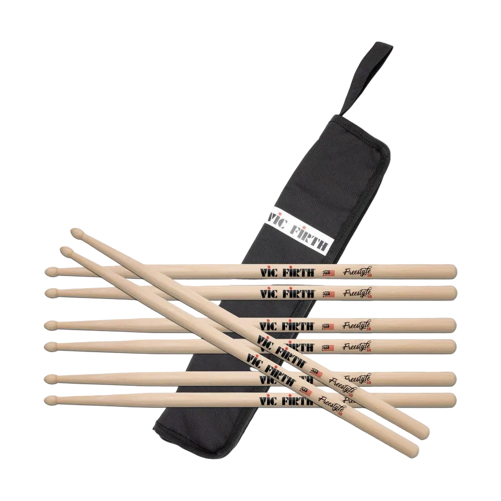 For a limited time, get four pairs of Vic Firth Freestyle 5B's and receive a free black essential stick bag. Perfect for drummers in search of the comfortable 5B diameter with some extra reach and exaggerated taper.